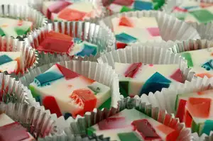 Farklı renkteki jöleleri küp küp kesin ve harmanlayın. Bir borcama serin.Suyun içinde jelatini eritin ve biraz süt veya krema ekleyin. Bu sıvıyı, jöle küplerinin üzerine döküp, buzdolabında soğutun. Küçük parçalar halinde kesip, ikram edebilirsiniz.Eki Görüntüle 1279024