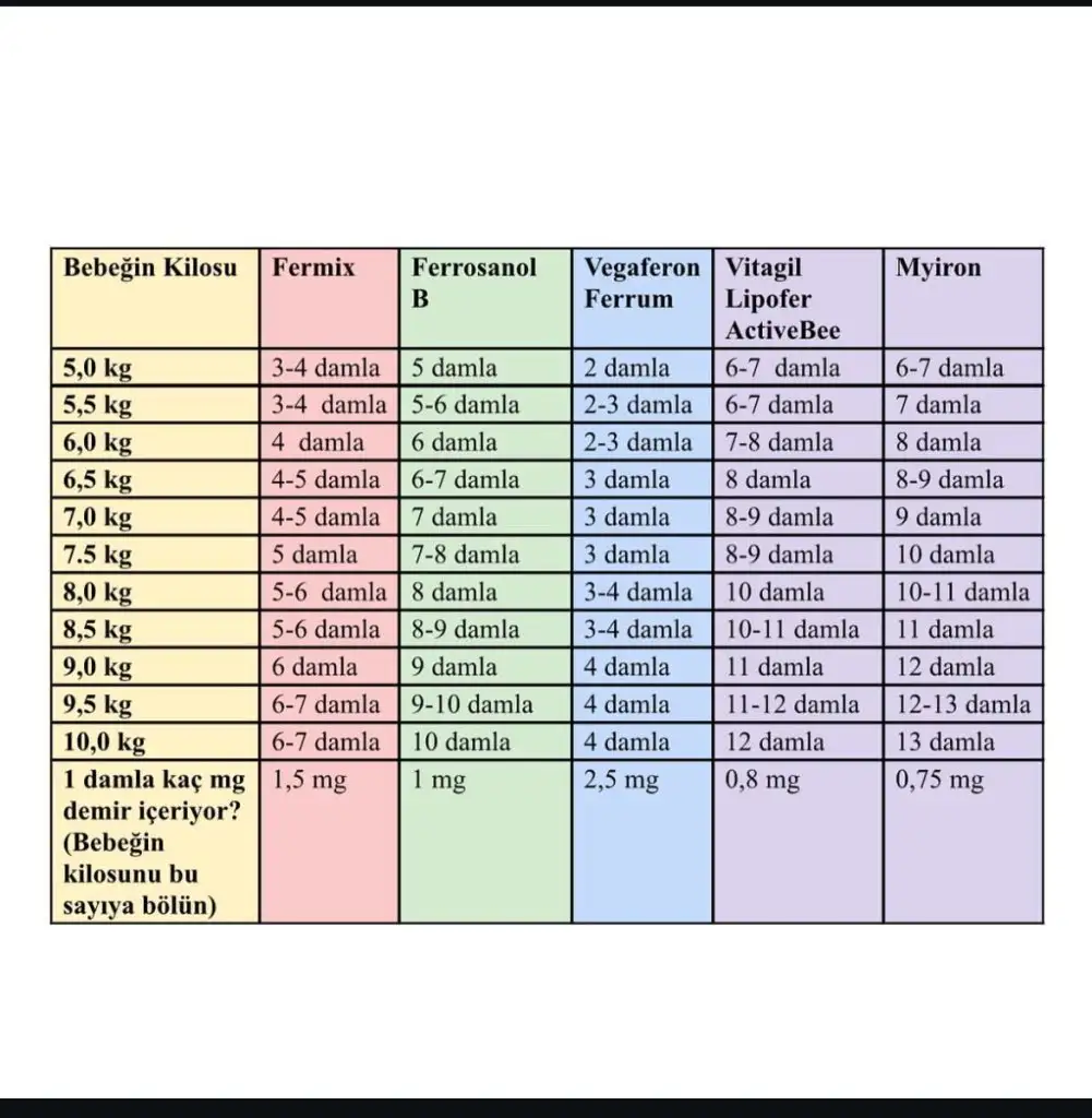 1 ml’de 7 mg demir var. Kilo başına minimum 1 mg almaları gerekiyor zaten. 1,5 ml normalde içmesi lazım. Ben eksik tamamlansın diye 2 katını veriyorum yani..