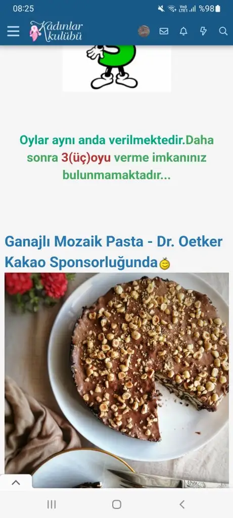 Oylama için link dağıtmak,Oy istemek kesinlikle YASAKTIR... :KK200: 3 oy hakkınız bulunmaktadır..:KK200: Oylar aynı anda verilmektedir.Daha sonra 3(üç)oyu verme imkanınız bulunmamaktadır... Ganajlı Mozaik Pasta - Dr. Oetker Kakao Sponsorluğunda:KK56: Yanardağ Pasta - Dr. Oetker...www.kadinlarkulubu.com