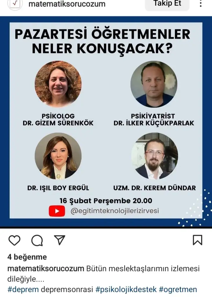 Tarifi imkansiz su zor gunlerde hayatini kaybedenlere uzuldugumuz kadar geride kalanlar icin de ayakta durmaliyiz. Ben Tarsus'ta gorev yapan bir ogretmenim. Bircok depremzedenin goc edecegi ilk adreslerden biri. Ikinci donemle birlikte bircok depremzede cocugumuz olacak siniflarda. Birkac gundur bunu dusunuyorum. Bizler o cocuklara en saglikli sekilde nasil yaklasacagiz? Bunun icin burada yer alan rehberlik ogretmenleri, pedagog arkadaslar lutfen bize yol gosterin. Tek istegim o cocuklarin en az psikolojik zararla bu sureci atlatmalari ama bu durum o kadar hassas, o kadar istisnai ki. Bizlere yapabiliyorsaniz egitimler verin lutfen. Belki cogu okula gelemeyecek ama gelecek bir tek öğrenci bile oyle onemli ki.