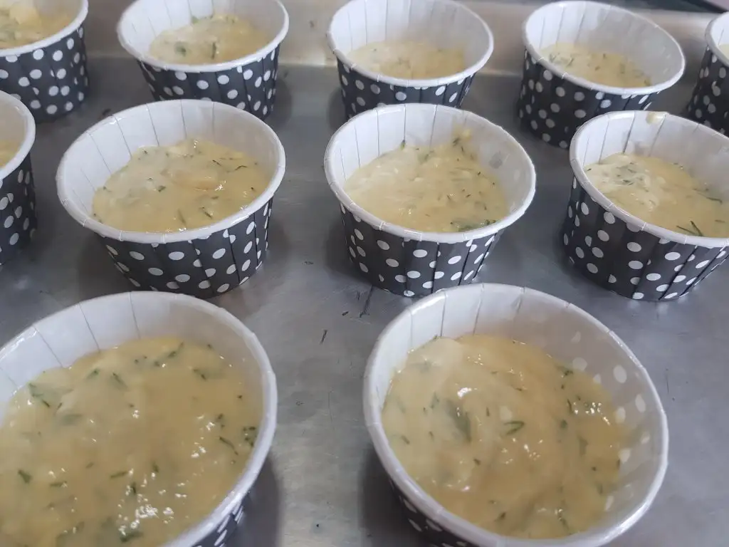 Muffin kağıtlarının içine 1,5 yemek kaşığı kadar hamurdan koyalım (12 muffin kasesine eşit dağıtalım.)
