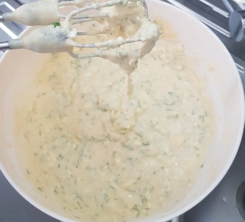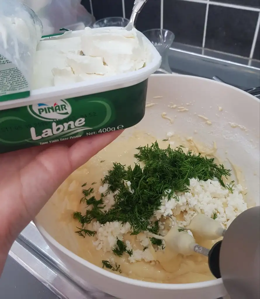 Son olarak labne peynirimizi, ufalanmış beyaz peynirimizi ve dereotunu da ekleyip kaşıkla güzelce karıştıralım.