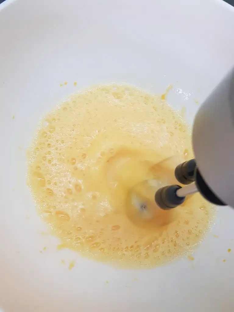 Çukur bir kaba yumurta ve yağı koyarak 2-3 dakika mikserle çırpalım.