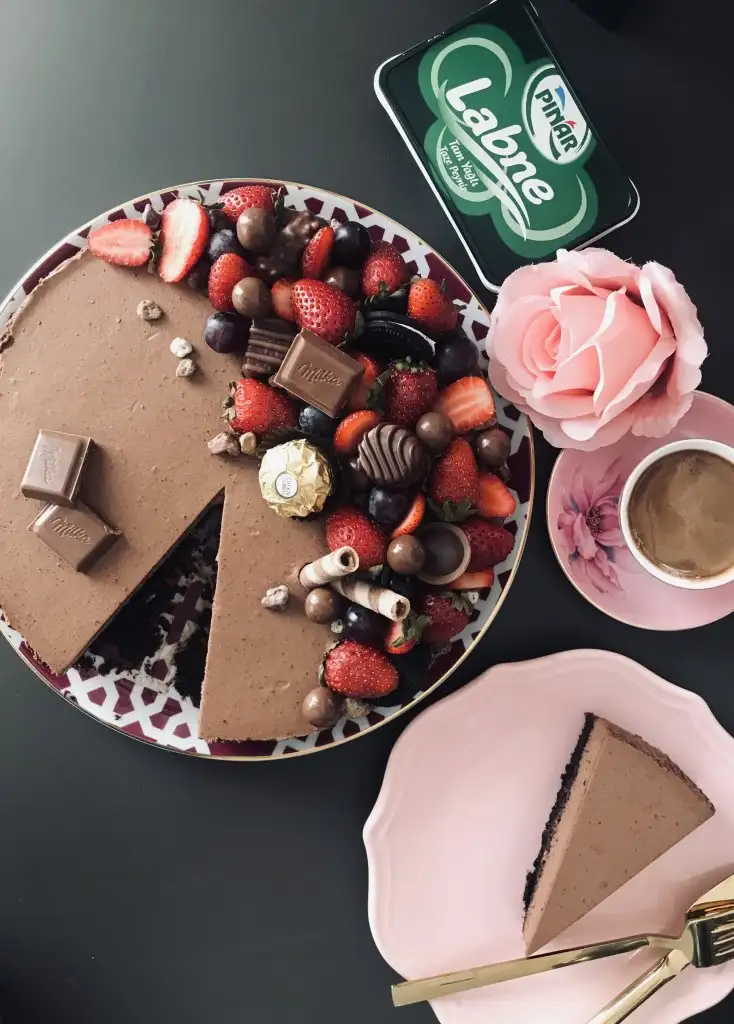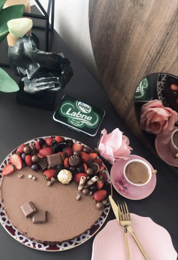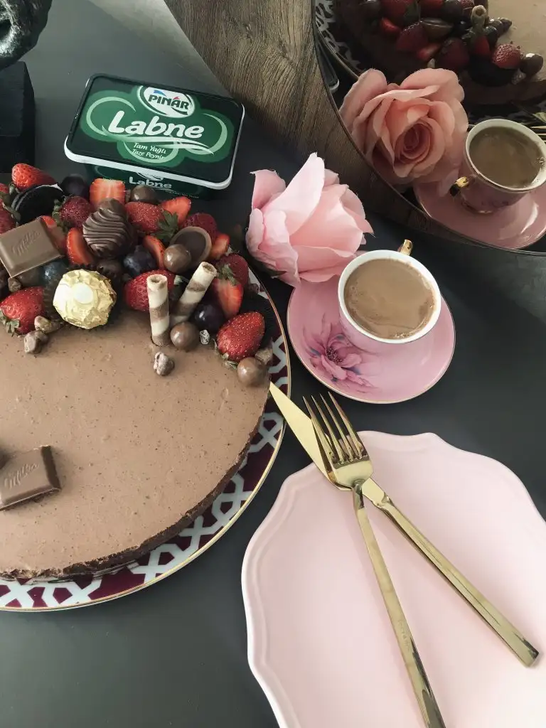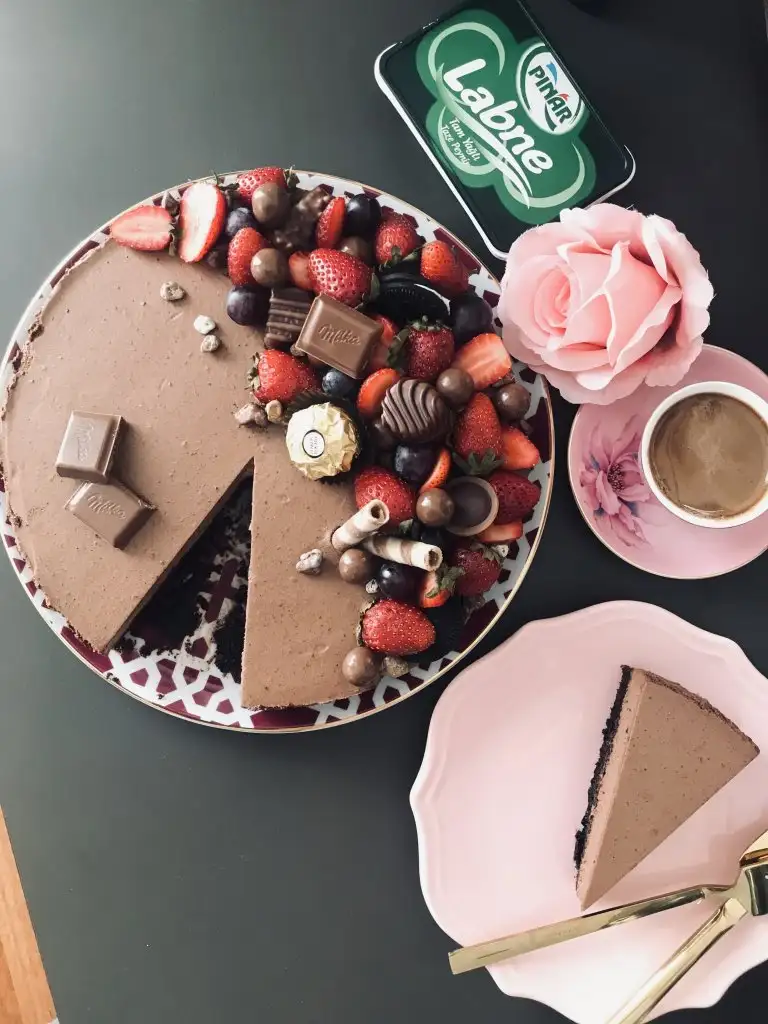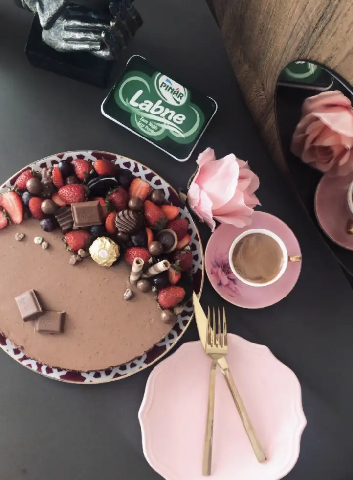 Çikolatalı mus için çikolataları benmari usulü eritelim. Sıvı krema, Pınar Labne ve pudra şekerini krema koyu bir kıvam alıncaya kadar çırpalım. Hazırladığımız kremaya erittiğimiz ve soğumuş olan çikolatayı da ilave edip karıştıralım. Daha sonra kremayı soğuyan kekimizin üzerine dökelim ve düzeltelim. Hazır olan pastamızı bir gece buzdolabında soğuması için bırakalım.