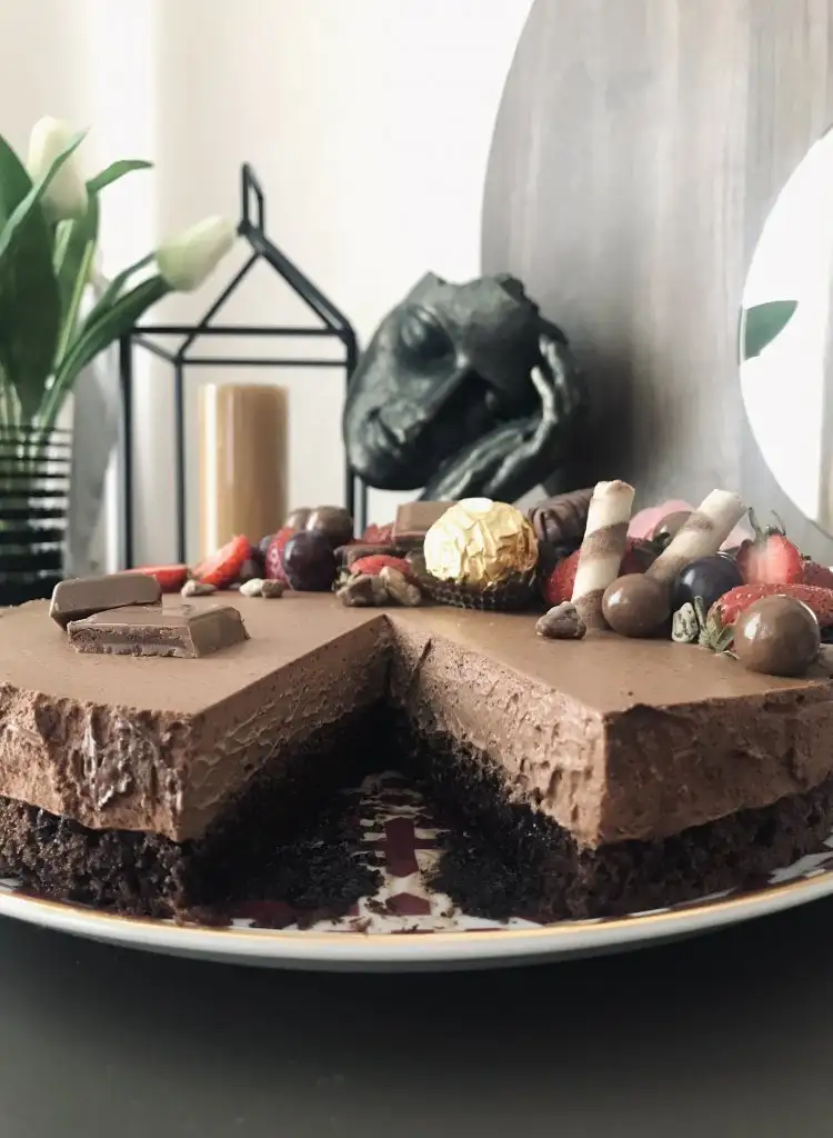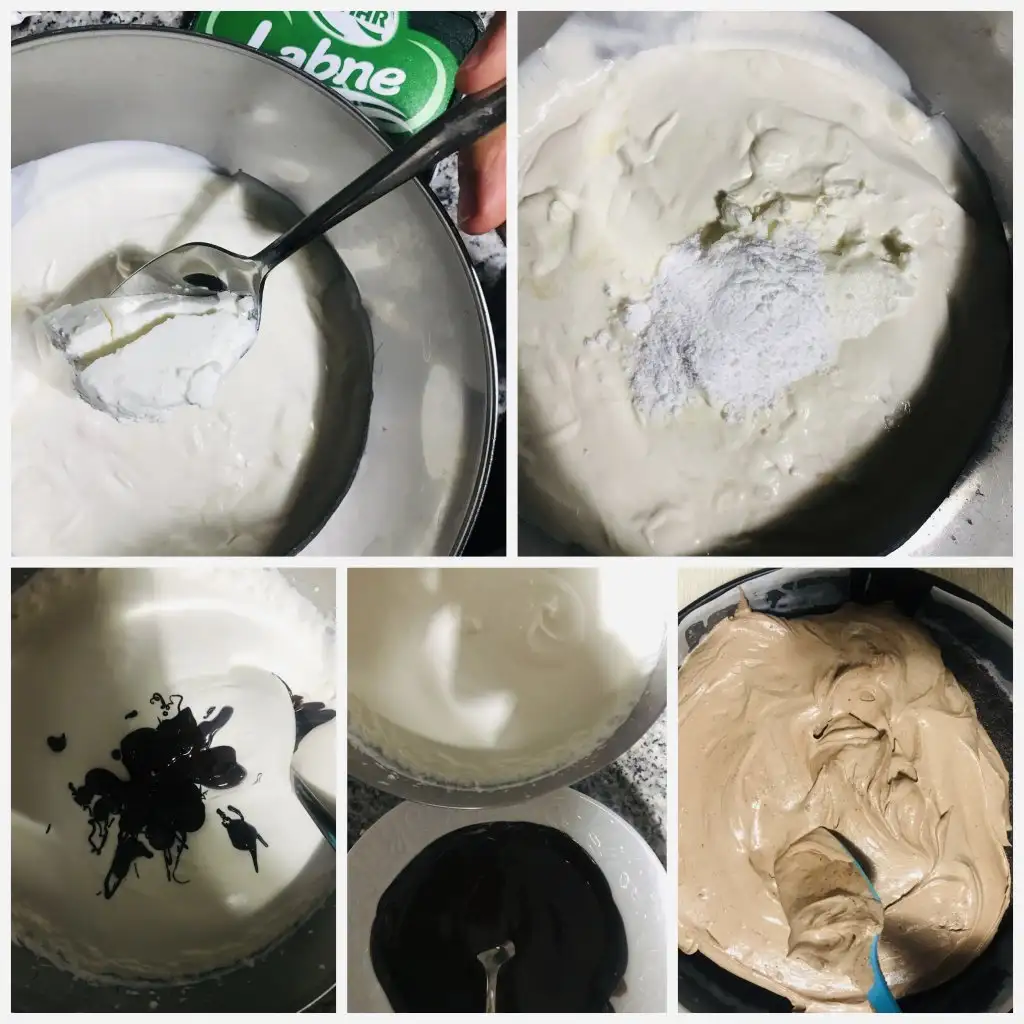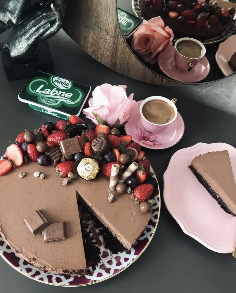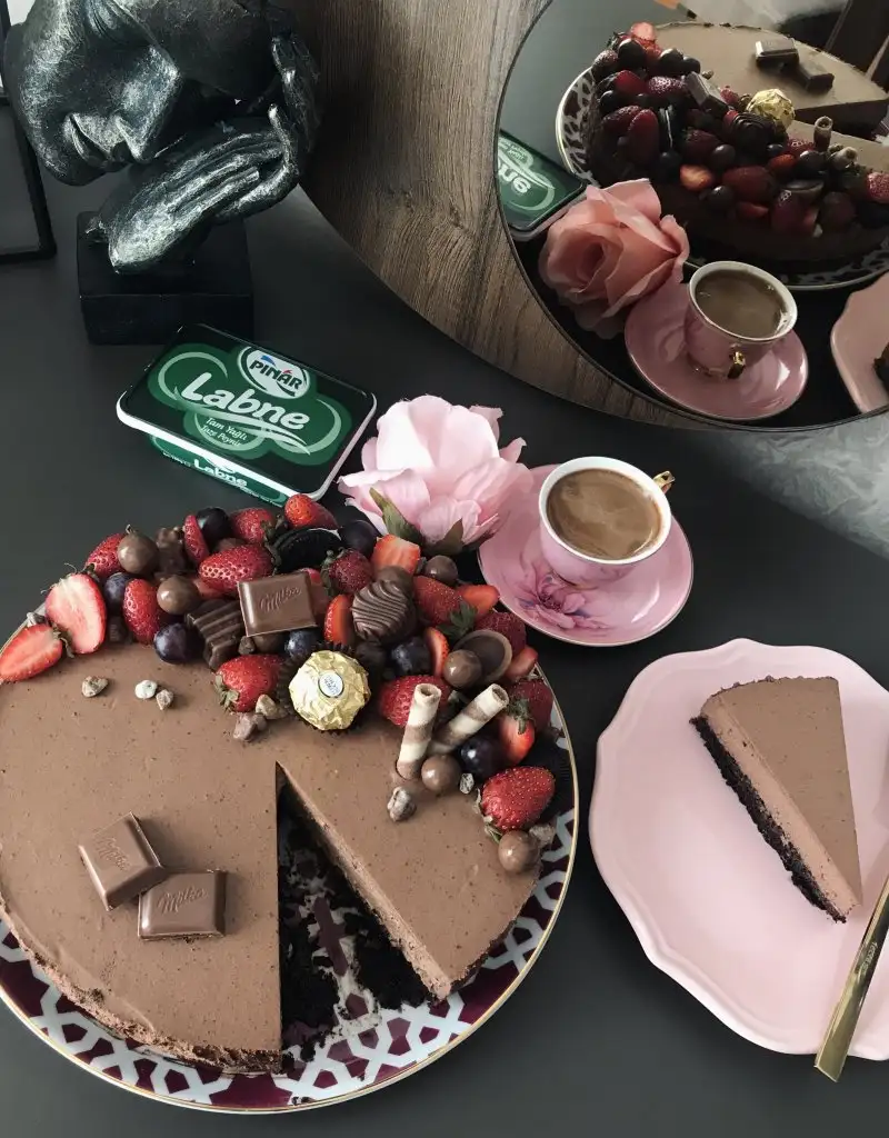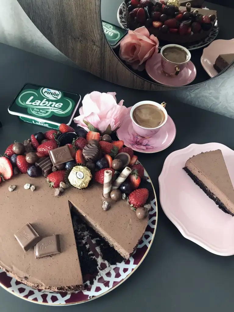 Çikolatalı mus için çikolataları benmari usulü eritelim. Sıvı krema, Pınar Labne ve pudra şekerini krema koyu bir kıvam alıncaya kadar çırpalım. Hazırladığımız kremaya erittiğimiz ve soğumuş olan çikolatayı da ilave edip karıştıralım. Daha sonra kremayı soğuyan kekimizin üzerine dökelim ve düzeltelim. Hazır olan pastamızı bir gece buzdolabında soğuması için bırakalım.