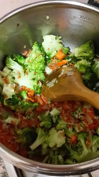 Havuçlar rengini saldıktan sonra bir kenarda bekletmiş olduğumuz pirinç, mercimek ve bulguru içine ekliyoruz. Çok kavurmanıza gerek yok, mercimekler ve bulgurlar tencerenin dibine yapışabiliyor. Bir kaç sefer karıştırdıktan sonra brokolilerimizi ekleyebiliriz. Onları da biraz karıştırıp suyunuzu ekleyebilirsiniz. Suyun ölçüsü 5 su bardağı kadar olacaktır. Eğer ilikli kemik kaynatılmış ise, kemiklerin bulunduğu suyu güzelce süzmek gerekir, içerisine kemik kaçmamış olması çok önemlidir ve bunun haricinde kemiklerin içlerinde bulunan ilikleri de bu suya çıkartmanız gerekir. Biraz uğraşlı gibi gelse de bir çöp şiş veya kürdan yardımı ile bunu yapabilirsiniz. Bu suyu direk çorbaya katabilirsiniz. Çorbamızın suyunu da ekledikten sonra baharatlarımızı ekleyebiliriz ve güzelce karıştıralım. Düdüklünün kapağını kapatalım ve yüksek ateşte düdüğü yukarda olacak şekilde bırakalım.