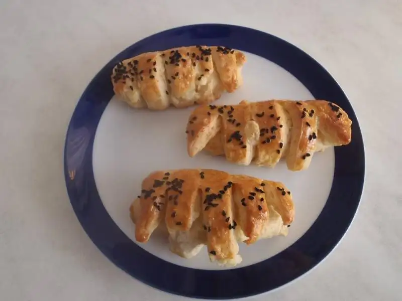malzemeyi yoğurup,hamuru 2 'ye böl,böldüğün hamurları pazı haline getir,pazıları merdane ile açıp aralarına erimiş margarin sür,ayni işlemi diğer hamurada yap ,sonra pazıları merdane ile büyüt ne şekil yapmak istiyorsan şekillendirip tepsiye diz ,mayalanınca yumurta sarısını sürüp susam serp afiyet olsun..