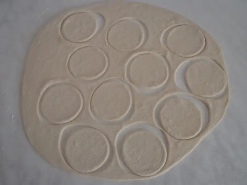 arasını yağladığımız pazıları merdane ile büyük'çe açtırıp,bardakla kesiyoruz ( bardağın büyüklüğü size kalmış) diğer pazılarada aynı işlemi yapıyoruz