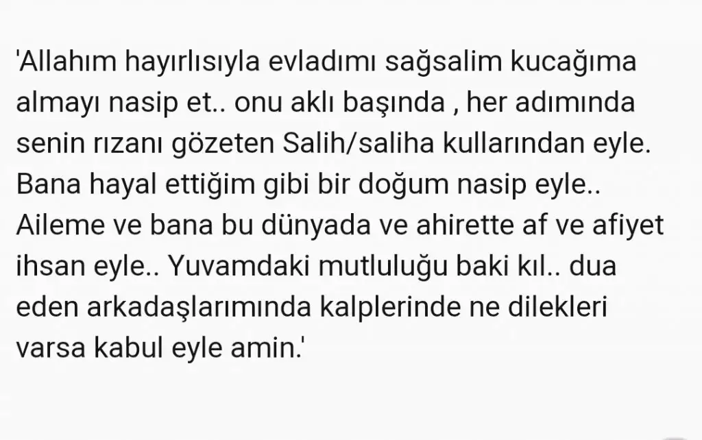 'Allahım hayırlısıyla evladımı sağsalim kucağıma almayı nasip et.. onu aklı başında , her adımında senin rızanı gözeten Salih/saliha kullarından eyle. Bana hayal ettiğim gibi bir doğum nasip eyle.. Aileme ve bana bu dünyada ve ahirette af ve afiyet ihsan eyle.. Yuvamdaki mutluluğu baki kıl.. dua eden arkadaşlarımında kalplerinde ne dilekleri varsa kabul eyle amin.'
