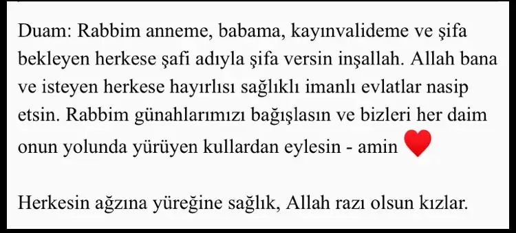 Hayırlısı canım inşallah Allah tez zamanda müjdeli haberler nasip ederBana başlarda okunmuştu canım. Tedaviye başlayacaktım rica etmiştim Zeyno dan . Maalesef olumsuz sonuçlandı.
