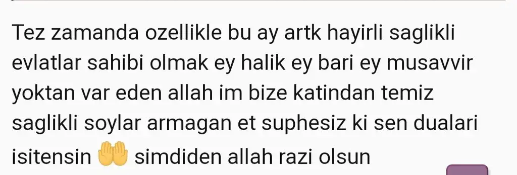Tez zamanda ozellikle bu ay artk hayirli saglikli evlatlar sahibi olmak ey halik ey bari ey musavvir yoktan var eden allah im bize katindan temiz saglikli soylar armagan et suphesiz ki sen dualari isitensin 🤲 simdiden allah razi olsun