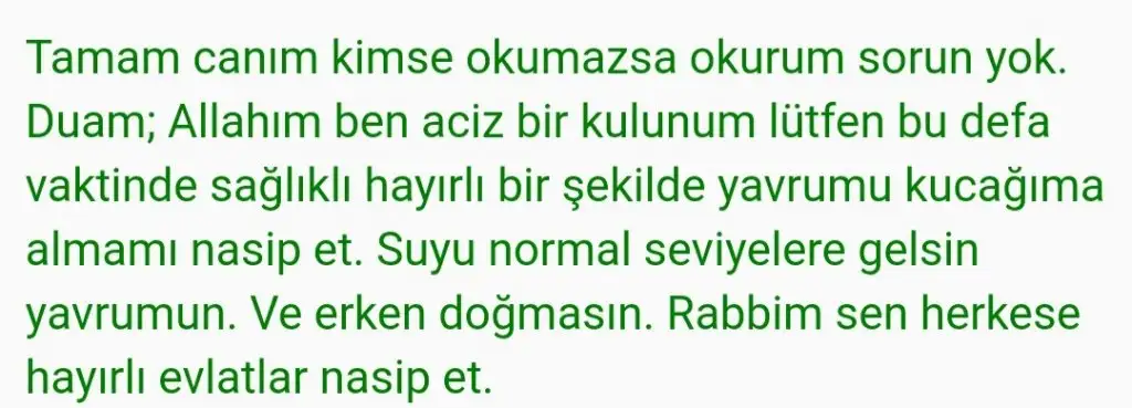 Duam; Allahım ben aciz bir kulunum lütfen bu defa vaktinde sağlıklı hayırlı bir şekilde yavrumu kucağıma almamı nasip et. Suyu normal seviyelere gelsin yavrumun. Ve erken doğmasın. Rabbim sen herkese hayırlı evlatlar nasip et.