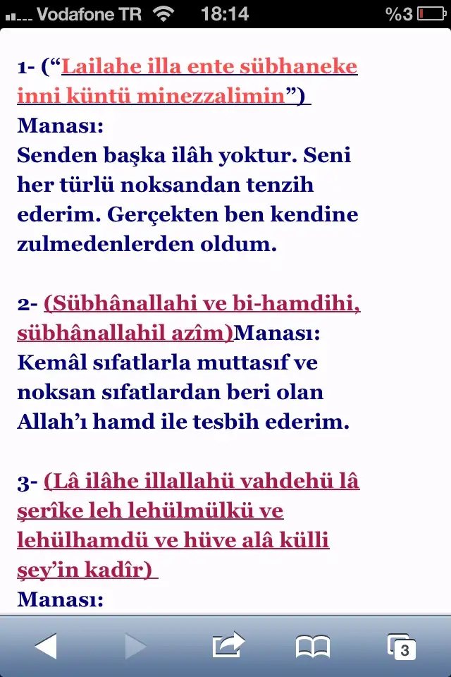 Anlamı: Ya Rabbi! Senden başka mabud(ilah) yoktur. Seni noksanlıklardan tenzih ederim, ben şüphesiz zalimlerden oldum..