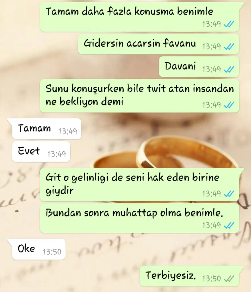 24 ve 26. Az once msj atmis biraz kokonustuk. Bundan sonra ihtiyacım olan hicbirsey icin hesap vermeyecegimi belirttim. Hesap istemeyen birini bulup evlenmemi, hesap verecegi birini bulacağını söyledi. Annesinim yanına ankaraya gidecektikbugun. Ben gelmeyecegim dedim. Bende Izmire kendi ailememi gitsem bilemedim.. Bosanacagim diyor.