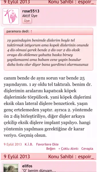 Bu linke bir bak http://www.kadinlarkulubu.com/forum...onceki-ve-sonraki-yani-bitmis-halleri.594797/Arkadaşlar benim iki kesici eksik, ortası aralık. Dr yeterince aralık olmadığı için implant yeri açmak yerine bütün dişleri önde toplayıp köpek dişlerine kesici görüntüsü vereceğiz dedi. Aklıma yatmadı. Bu sefer arka dişler iyce öne gelecek. Böyle bir tedavi olan var mı?