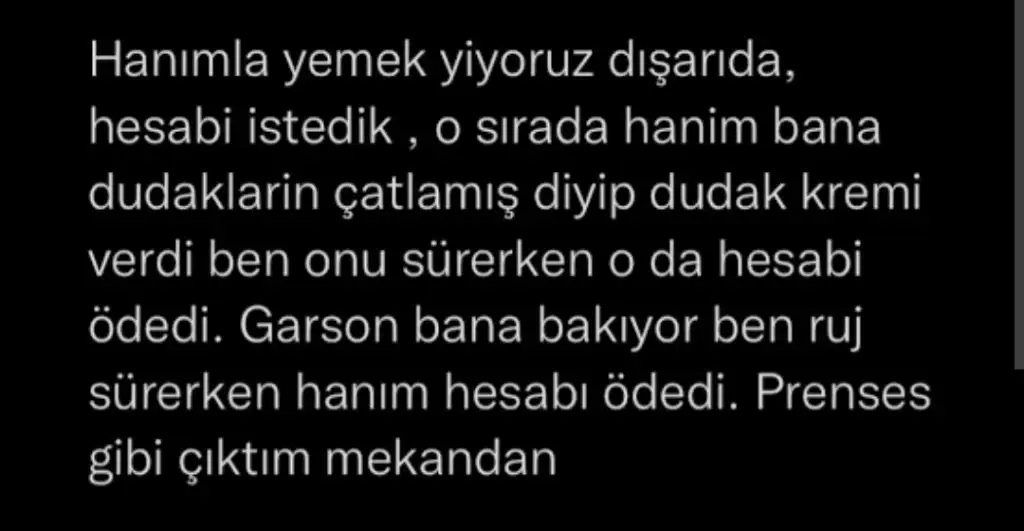 Niye garip oluyor ?İlla erkek ödemeli diye bir şey yok elbette ama ben de erkeğin ödemesine izin vermek lazım diye düşünüyorum. Mesela benim kredi kartımda restoran indirimi var, eşim bazen sen öde diyor, bir tuhaf oluyor, ben kartımı eşime veriyorum o ödüyor yine benim kartımdan. Şimdi erkeğe hesap ödetti diye kadın illa ki para yiyici olmuyor, kadın da sonrasında bu self servis zincirlerde pasta, kahve ısmarlayabilir örneğin, ya da konser bileti alır. Yine dengelenir yani maddi olarak.