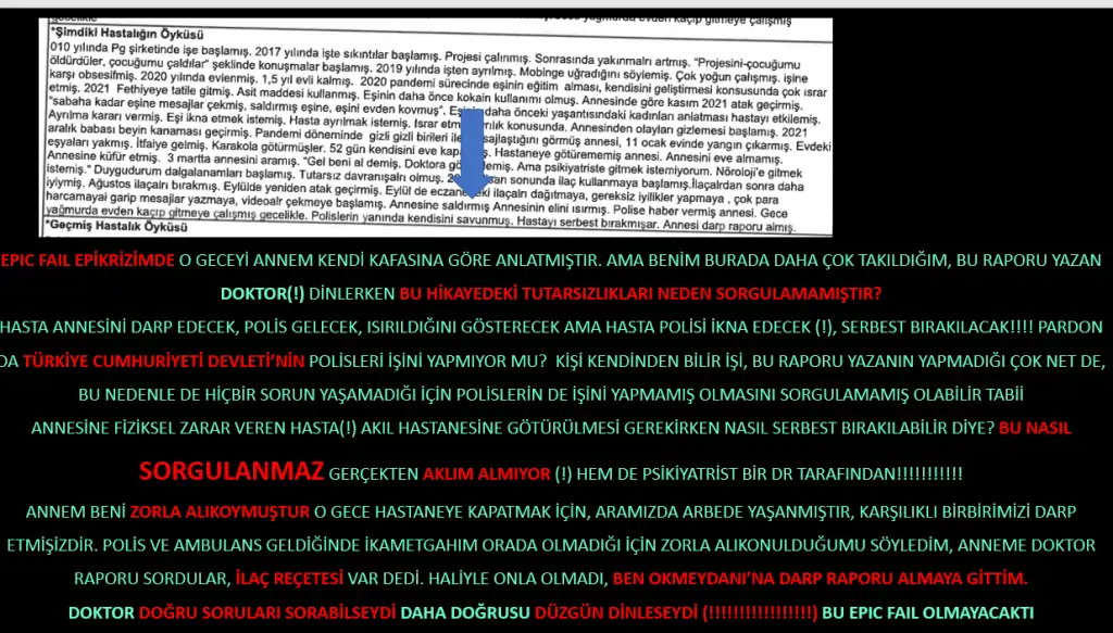 EEG'm çekildi mürekkep testim yapıldı ve bana Duygu Durum Bozukluğu Diğer Ön Tanısı kondu, BİPOLAR mıyım diye sordum, şimdilik öyle diyemeyiz dedi. Doktorumu oldukça akademik buluyordum ve inanıyordum verdiği 2 ilacı kullanırken, takip randevularıma giderken ağustos ayında korkunç bir depresif atak yaşadım. İntihar etmemek için kendimi durduramıyordum, mahkemeler yüzünden kariyerimi mahveden beni ekonomik olarak kendine bağımlı hale getiren ANNEmi yani CELLADIMI aramak durumunda kaldım, hastaneye yatmak için. Sonunda istediği de olacaktı ve akşam 9 gibi hastaneye gittik. Sadece bana ilaç versinler ve acımı dindirebileyim istiyordum, pek kendimde değildim. Neler konuşuldu neler yapıldı hatırlamıyorum (EKT yan etkisi de olabilir) bana 8 seans EKT yazdığını hatırlıyorum doktorun. 2 hafta içerisinde 8 seans EKT ve çok yoğun ilaç tedavisine maruz kaldım, PSİKOTİK ÖZELLİKLİ DUYGU DURUM BOZUKLUĞU NEDENİ İLE. Taburcu olduğumda günde 9 ilaç alıyordum. Çarmıha gerilmişim, alev alev ateşlerin içerisinde yanıyordum ve her yer karanlıktı, artık ÖLMEK değil YOK olmak istiyordum. Beni durduran tek şey MAİDE SURESİ 32. ayetiydi. Kişinin kendini öldürmesi de bir kişiyi öldürmesi anlamına geliyordu. Ben katil olamazdım ama yaşadığım her dakika bana sonsuz bir azap veriyordu. Ecelime gün sayıyordum bir yandan da iyileşebilmek adına resmen doktorumla olan randevularımın peşinden koşuyordum. Kasımda yine dayanamadığım bir sabah doktordan Xanax yazmasını istedim, HER YOL MÜBAH diyerek yazdı. Ve ben taburcu edildikten sonra da kendi evime değil ailemin evine yani CEHENNEMİME geri dönmüştüm. Celladım yine ne yapmış etmiş beni kendisinin bakımına muhtaç hale getirmişti. Şikayetlerimi de geri çektim ama istismar soruşturması kapanmadı. Adli Tıp Kurumunda fiili ehliyetim değerlendirildikten sonra belli olacak. Ve müşteki sanıklı davada NP'nin verdiği belgeleri sunmam, şikayetlerimi geri çekmem nedeni ile mahkeme tarafından olumsuz değerlendirildim ve Bakırköy'de o geceki suçumda CEZAİ EHLİYETİM açısından değerlendirilmek üzere GÖZETİM ALTINA ALINMA KARARI çıktı. Maksimum 3 hafta sürecek şekilde. İtiraz ettik ama reddedildi ve karar aralıkda netleşti. Orası için hasta dosyamı hazırlayım derken birden AKLIM BAŞ'IMA geldi. Bana yanlış teşhis konmuş, yanlış bir tedavi uygulanmıştı. Annemin anlattığı yalan yanlış bilgilerle yazılmış EPIC FAIL bir EPİKRİZ raporu vardı elimde, hastaneden ilk çıktığımda bazı hataları fark etmiştim, düzeltilmesi için hastaneye yazdım ama dönüş olmadı. O şekliyle de mahkemeye vermiştim zaten. Nasıl bu kadar ŞUURSUZ olabildiğimi hala anlayamıyorum ama ilaçlardan ceset gibiydim. Düşünme yetilerimi kaybetmiştim, ACININ içerisinde kaybolurken. Nihayetinde anladım ki ben CELLADIMA sen beni ÖLDÜREMİYORSUN ama bak ben harika bir KİRALIK KATİL buldum bu sefer başarabilirsin dercesine kendimi CEHENNEMİN KANALİZASYONUNA ATMIŞIM. Ben 2019 yılında ölümcül düşük yaptım, laparoskopi ameliyatı oldum, iç kanamadan ölmek üzereydim. Ve annem bunu hayal ürünüm gibi anlatmıştı, birbirimizi darp ettiğimiz geceyi sadece ben darp etmişim gibi. Ortalama zeka seviyesindeki her bireyin dinlerken sorgulayacağı tutarsızlıklarla dolu annemin anlattığı hikayeyi, hala o hastanede nasıl doktorluk yapabildiğine inanamadığım doktor hiç sorgulamamış, benim eski hasta kayıtlarıma bile bakmayarak daktilo gibi yazmış. (2018-2020'de NP Feneryolu Tıp Merkezinin hastası olmuştum, ve düşük sonrası girdiğim ağır depresyon nedeni ile bana PROZAC ve Xanax yazılmıştı). Öğrenim durumuma üniversite öğrencisi yazacak kadar dehşet bir EPİKRİZ. Anamnez, hasta öyküsü, teşhisin ve