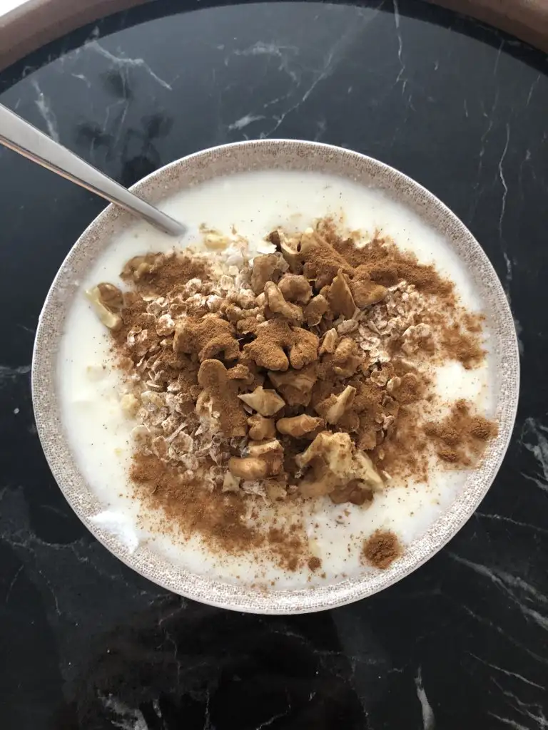 Biraz kefir biraz yoğurt bir yemek kaşığı yulaf 2 yumurta iki adet ceviz üzerine tarçın (bayağı doyurucu oluyor)