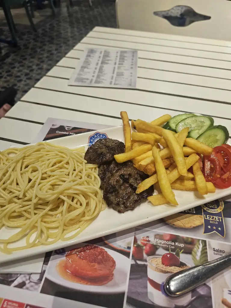 akşam yemeğim. Köfteleri ve sebzeleri yedim. Bir kaç kızartma yedim. Makarnaya dokunmadım.
