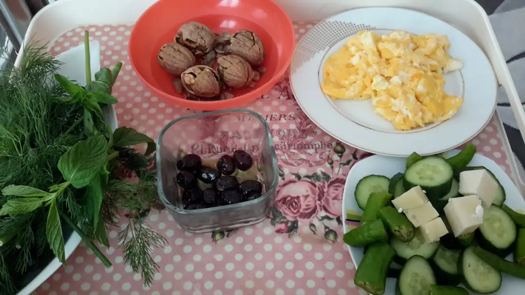 Dünki kahvaltım böyleydi. Oglen 800 ml ayran, 1 avuc kuru yemis yedim. Dışarı çıkmak zorunda kaldığım için akşam öğünü için bir dilim kek yemek zorunda kaldım. Misafirlige gittiğimizde yerde yiyebilecegim başka hiçbir şey yoktu