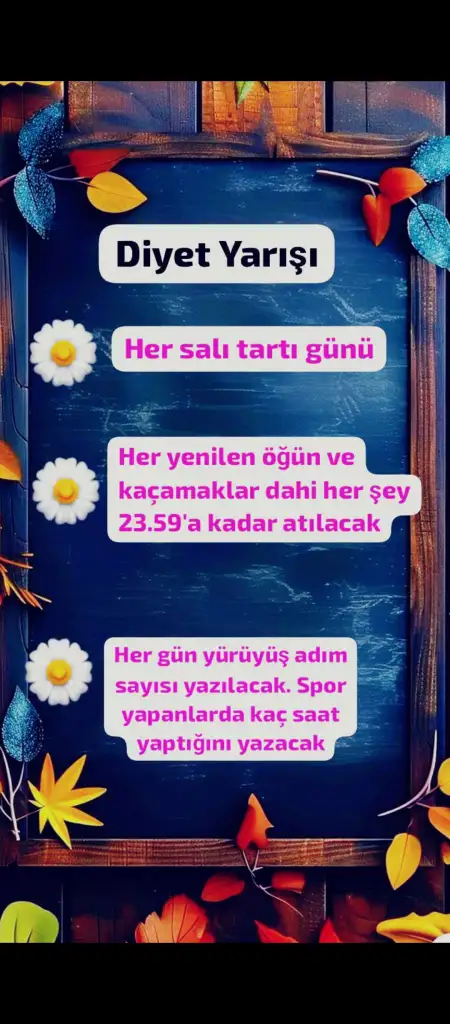 Kızlar merhaba. Benim 10 kilo fazlam var kendime diyet spor vs arkadaşları arıyorum. Benimle beraber her gün yediğini içtiğini buraya atacak ve birbirimize yanlışlarımızı söyleyip uyaracak ve her gün yürüyüş yaparak adım miktarının ekran fotoğrafını buraya atacak arkadaşlar arıyorum. Haftada bir tartı günümüz olsun. Birbirimizi motive ederek ilerlersek ciddi kilolar elde edeceğimize inanıyorum. Aktif olabilecek 10 kişi var mı