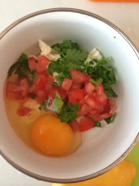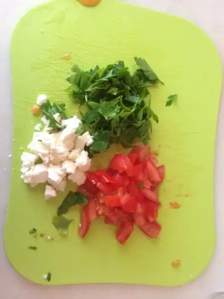 Az domates az maydanoz. Hatta nane de olabilir. Hiçbir şey koymaya da bilirsiniz yeşillik olarak.