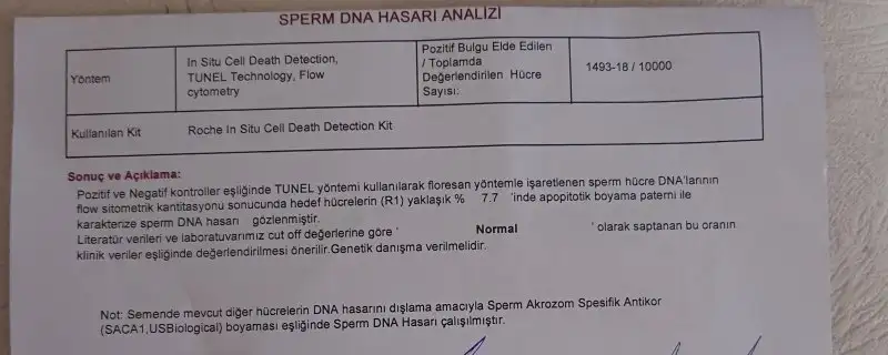 Arkadaslar 5 yıllık evliyim 4 tüp denemem var 1 düşüğüm var. Gecen ay dna hasar testi vermıs tık. Sonucu bugun aldım ama merak ediyorum. Doktora da eylülde gidecegim anlayan varsa Bı bakabılırmısınız