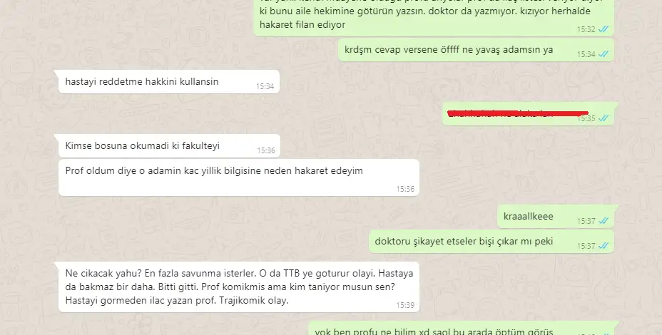 Organ nakilli bir ablam var. Genel takibini profesör yapıyor. Bu tip hastalar her ilacı alamazlar. Biraz üşütmüş, grip var, ateş yükseliyor. Bu durumlar organ nakilliler için tehlikelidir. Hocamızı aradık, böyle böyle durumlar ne yapalım dedik ilaç listesi verdi, aile hekimine git yazsın dedi. Bunu aile hekimine iletince "hekesin bir özel doktoru var, bir ben kimsenin doktoru olamadım. Madem o kadar değerli doktorun senin için git o yazsın ilaçlarını" dedi. "Doktor bey her gribal enfeksiyonda üniversite hastanesine gidemeyiz, bu insanlar zaten bağışıklıkları düşürüldüğü için iki haftada bir hasta olan insanlar, sürekli üniversiteye gştmek randevu almak mümkün değil lütfen yazın" dedik dinletemedik. Üstelik hakaret ederek odasından kovdu bizi. Aynı durumu daha önce defalarca yaşadık ablamla ilgili.