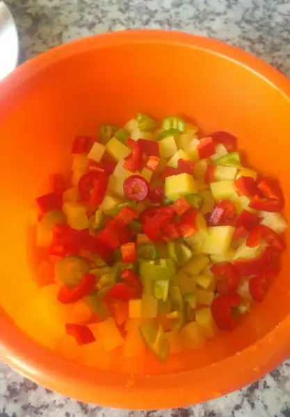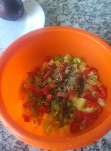 Yıkayıp soydugumuz patates ve havuclarimizi küp küp dogruyoruz.ardindan kapya biber ve yeşil biberimizi de dograyip küçük bir legenin icine koyuyoruz.üstüne baharatlarimizi ve zeytinyagini ilave edip hepsini harmanliyoruz
