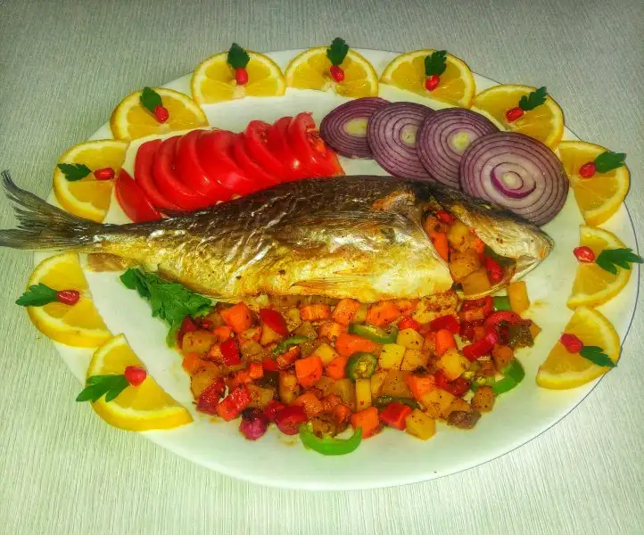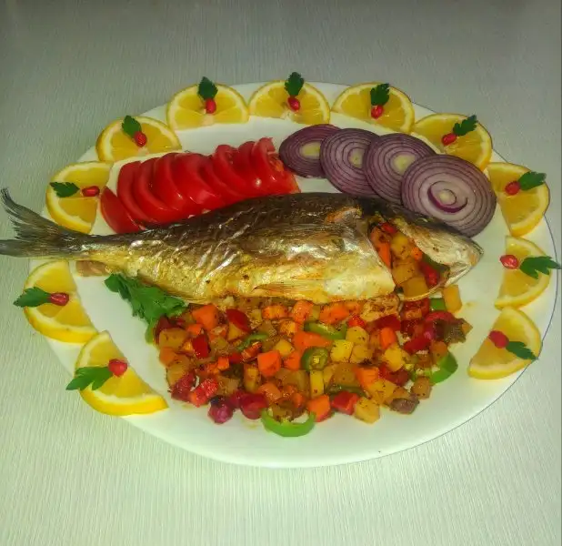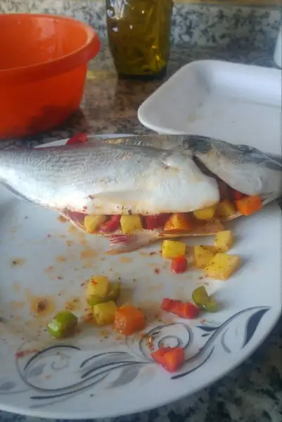 Temizlettigimiz balığı tekrar yıkayıp tuzluyoruz ve yağlı kağıt serdigimiz firin tepsisine yerlestiriyoruz.ardindan hazirlamis oldugumuz iç malzemesini içine dolduruyoruz.dilerseniz tamamini dilerseniz de yarısını doldurabilirsiniz.ben yan tarafini doldurdum sadece.