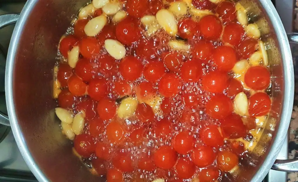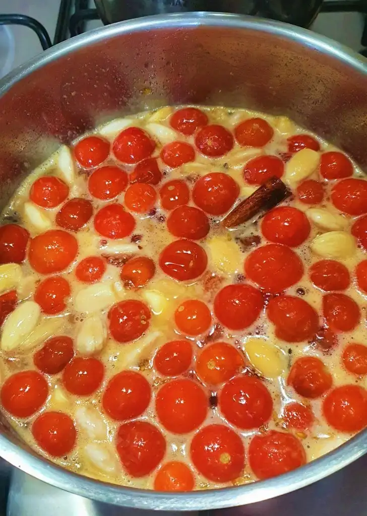 Yazın bahçedeki çeri domatesler çok fazla olunca eşe dosta,konuya komşuya dağıtıp,kuruttuktanda sonra bir miktarı ile de domates reçeli denemek istedim.İçerisine eklenen aromalı baharatlarla oldukça değişik bir şey oldu.Domates yediğinizi pek anlamıyorsunuz.Hatta eşim aşure gibi olmuş dedi