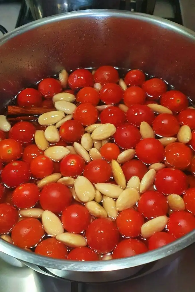 Yıkadığınız domatesler ve kabuklarını soyduğunuz tuzsuz bademleri, şerbet karışımına aktarın.Çubuk tarçın ve karanfilleri de ekledikten sonra kaynatmaya başlayın... Domatesler patlayıp, yumuşayana kadar yaklaşık 30 dakika, kısık ateşte reçeli kaynatın.
