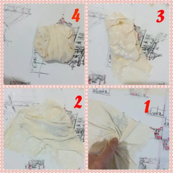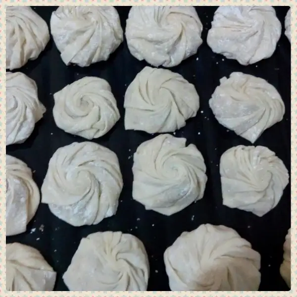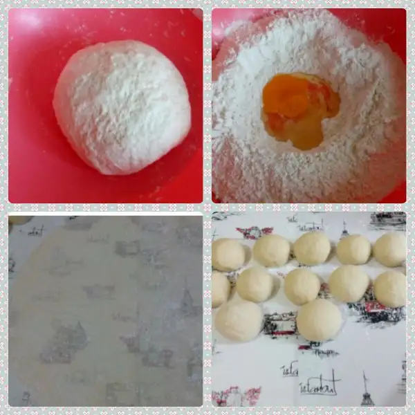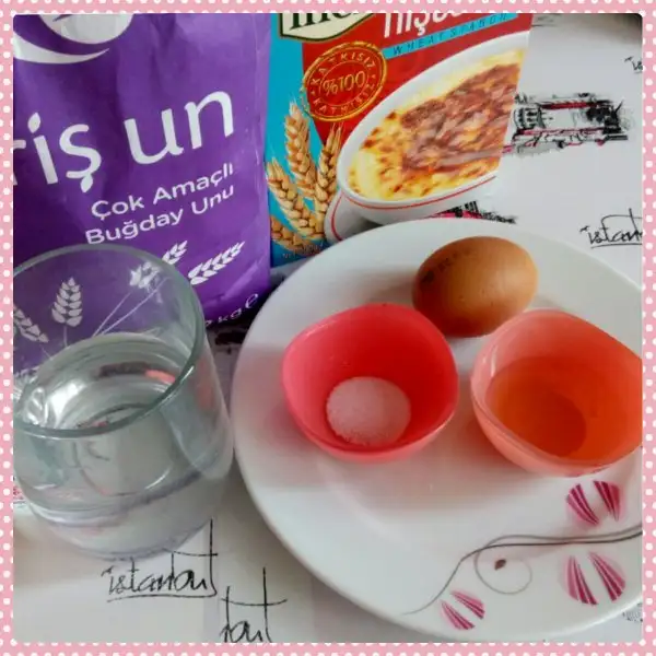 Yoğurma kabına unu alıp tuzu ekliyoruz. Unun ortasını havuz gibi açıyoruz. Yumurtayı ortaya kırıyoruz, sirkeyi ekleyip kenarlardan unu alarak yoğurmaya başlıyoruz. Kulak memesinden sert bir hamur olana kadar, azar azar su ekleyerek yoğuruyoruz. Üzerini nemli bezle örtüp 10 dakika dinlendiriyoruz. Hamuru cevizden biraz daha büyük bezelere bölüyoruz. 10 dakika daha üzeri örtülü dinlendiriyoruz. Bezeleri tatlı tabağı büklüğünde üzerine nişasta serperek açıyoruz. Açılan bezeleri 4 tane üst üste koyup ve ya tek tek oklava ile açılabildiği kadar ince açıyoruz.