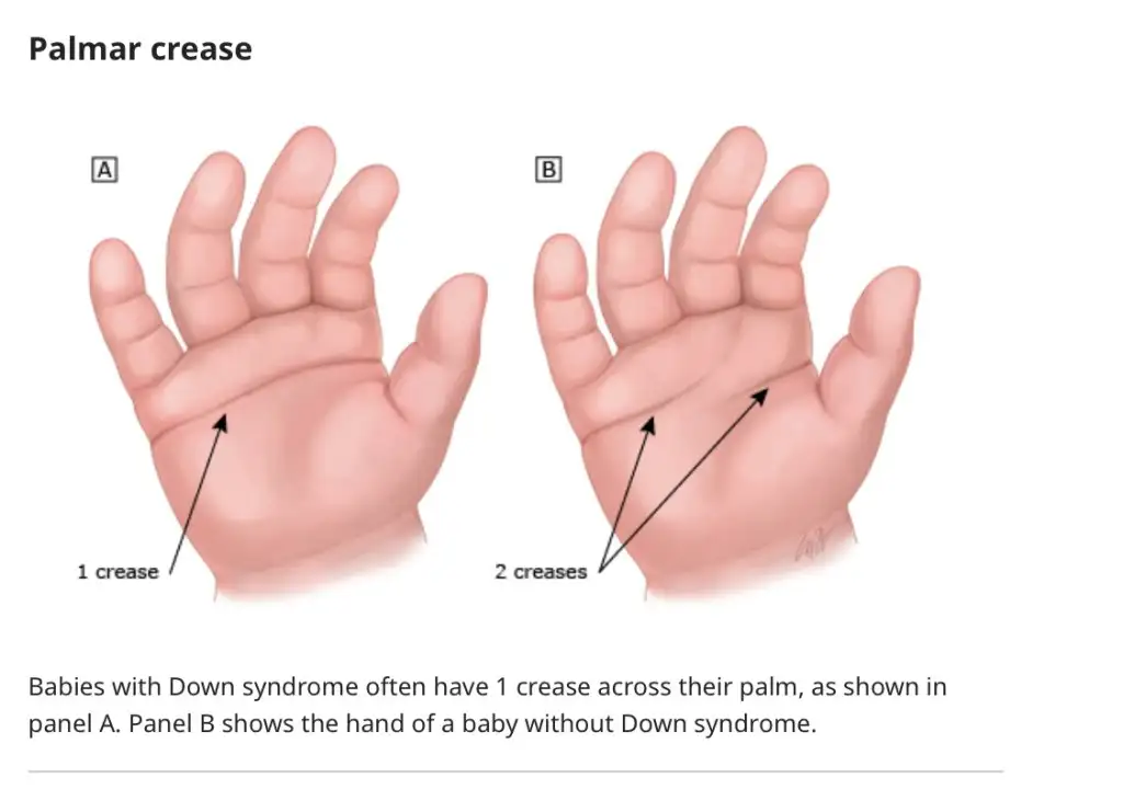 Sağlıklı insanlarda da bu çizgi olabiliyor.Genetik test yapmadan net bisey soylenmez ama bir de avuc icini inceleyin. Adaki resim downlu bebek eli