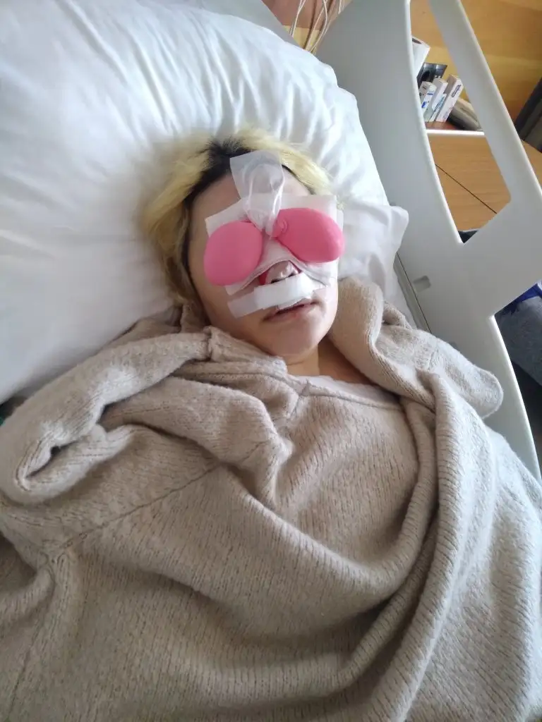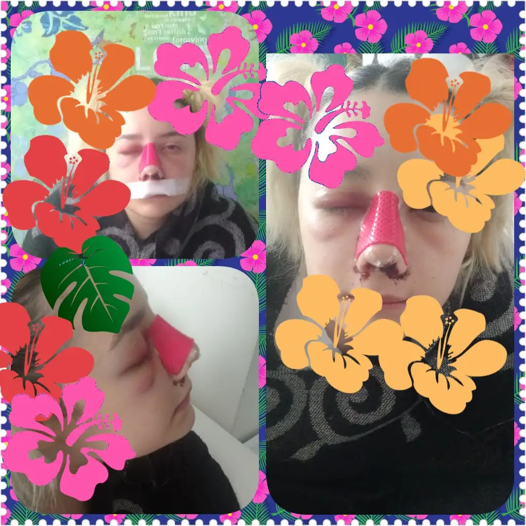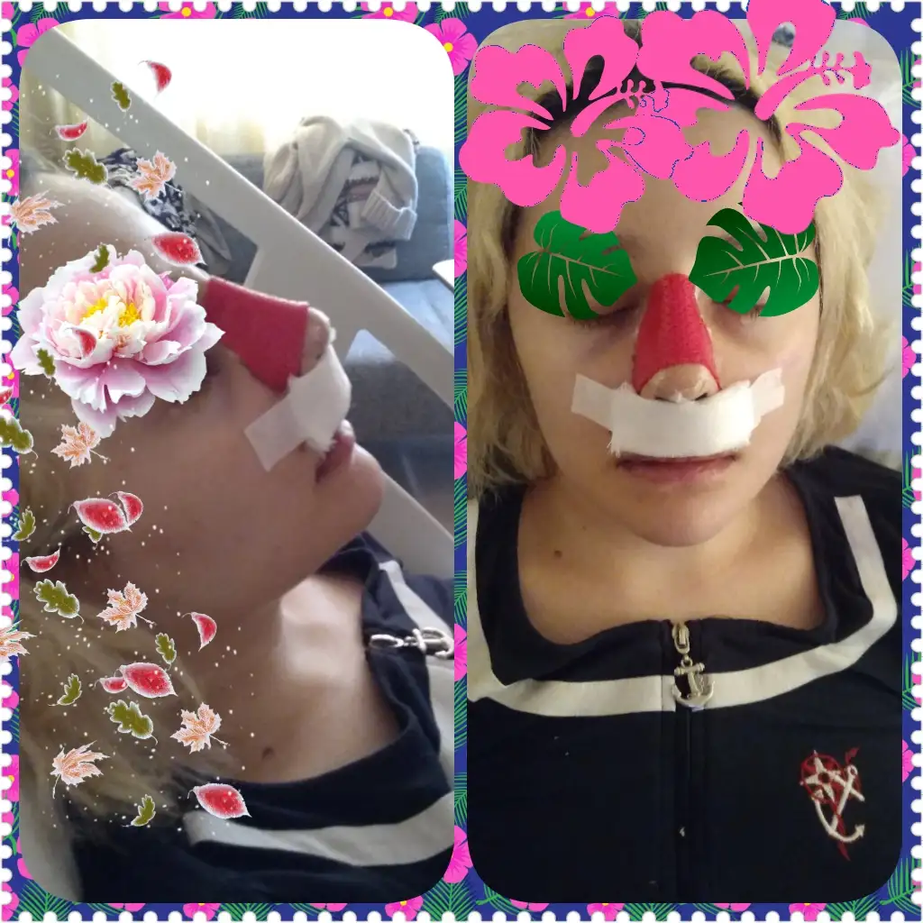 Şişlerin çoğu indi ama doğal olarak hala biraz var, yanaklar epey tombik hala. Burun bandajlı ve hafif şiş. Bu sabah burun derisinin inanılmaz kaşındığını söyledi kızım, iyileştiği için diye düşünüyorum. Bu sabah ki fotoyu paylaşıyorum.