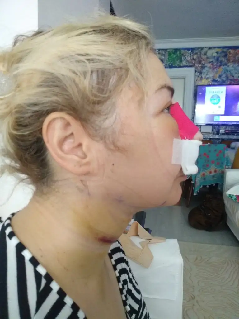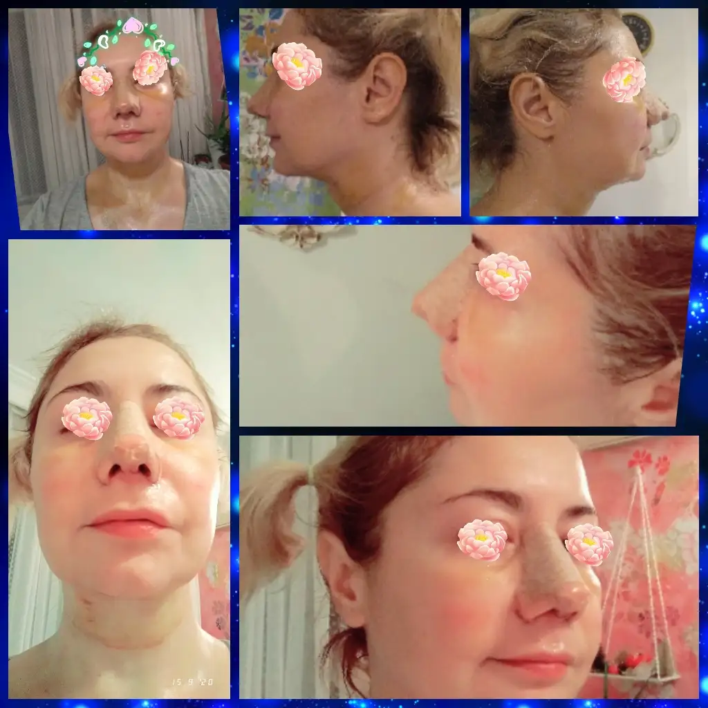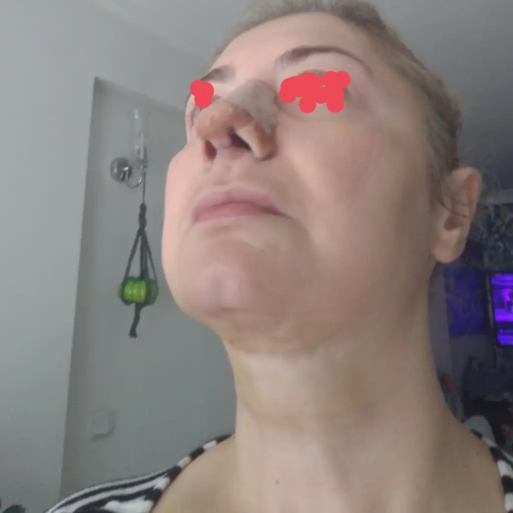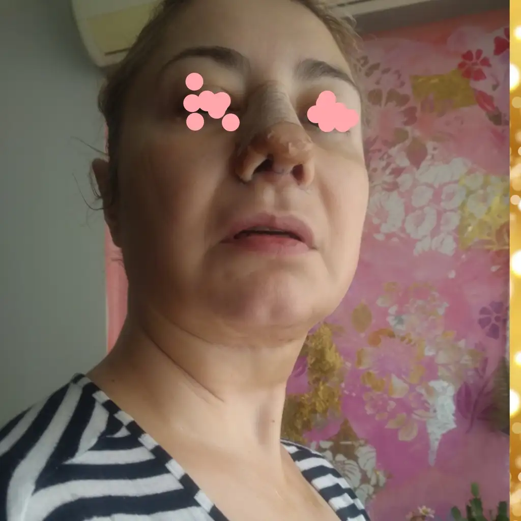 Merhaba, bugün 5.gün. Burnumda ağrı sızı yok sadece fıs fıs yapınca su geliyor, birde yapışan ilan kan karışımı var, gıdım daha iyi, yanaklar epey şiş çünkü korse sıkı ve sıvılar aşağı inmiyor, ilaç sürmek için çıkarınca sizler için resim çektim ve öncesi sonrası yaptım