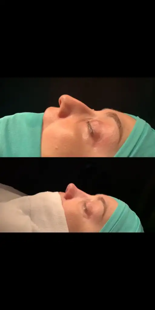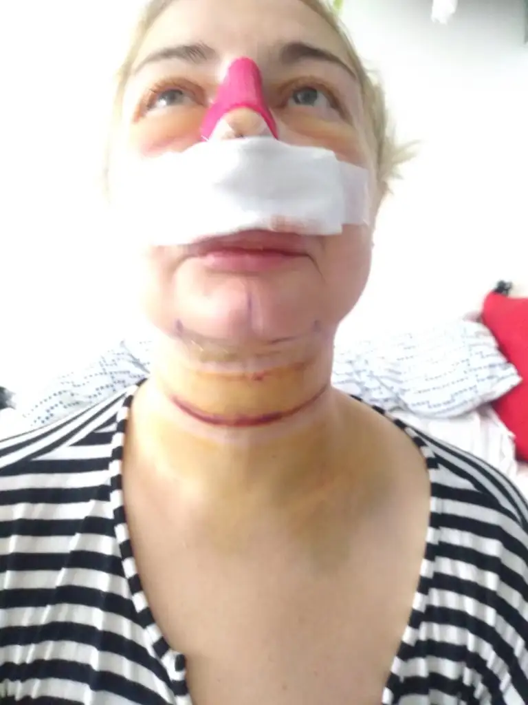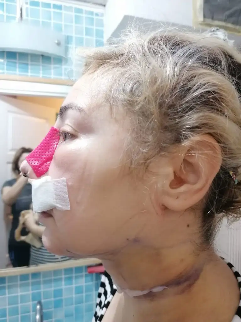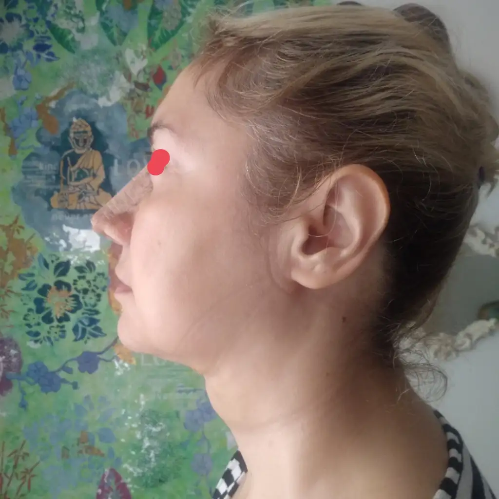 Merhaba, bugün 5.gün. Burnumda ağrı sızı yok sadece fıs fıs yapınca su geliyor, birde yapışan ilan kan karışımı var, gıdım daha iyi, yanaklar epey şiş çünkü korse sıkı ve sıvılar aşağı inmiyor, ilaç sürmek için çıkarınca sizler için resim çektim ve öncesi sonrası yaptım