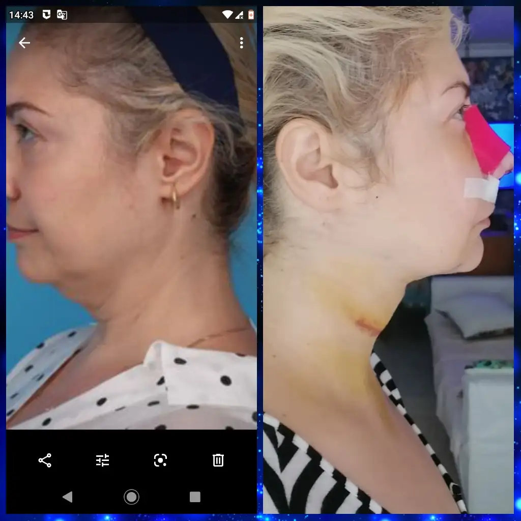 Boynumu o kadar düşündüm ki, burnumu detaylandırmadım, burnumun herhangi bir ağrı sızısı olmadı sadece benim yüzüm kızımdan daha çok şişti, morardı. Bende 2 burun ucu vardı yani kızımın ki kadar kolay olmamıştır diye düşünüyorum. Buraya ameliyat videomu yolluyorum. Yüzüm ve burnum hem liposuction hem de ince cilt etkisi ile o kadar şişti ki, neredeyse üzerindeki alçıyı atacak gibi hissettim. Burnum bu sabah 3 tık daha inmişti. Nefes sorunsuz alıyorum. Sürekli fıs fıs yapıyorum. Dudaklarım acayip şiş, o entübe borusu sıkıştırmış üstüne kafamdaki korse de sıkıyor. Bu sabah boynumun bu sefer de sağ tarafı ağrıyıp, çok az şişti. Olucak artık. Korseye alıştım. İlk 2 gün o sıkıntıyla sürekli, "kendi rızamla takıyorum" deyip durdum. Burnum, o kadar büyük duruyor ki henüz neye benzediğini tahmin edemiyorum. Kızımın şu anda 26. Günü, mükemmel duruyor. İnşallah benim de öyle olur. Doktor videoyu gösterdiğinde anlayamadım bile, merak etme videodan daha güzel oldu dedi. Doktoruma gerçekten güvendiğim için kafama takmıyorum şimdilik. Zaten hiç bir şey belli değil.