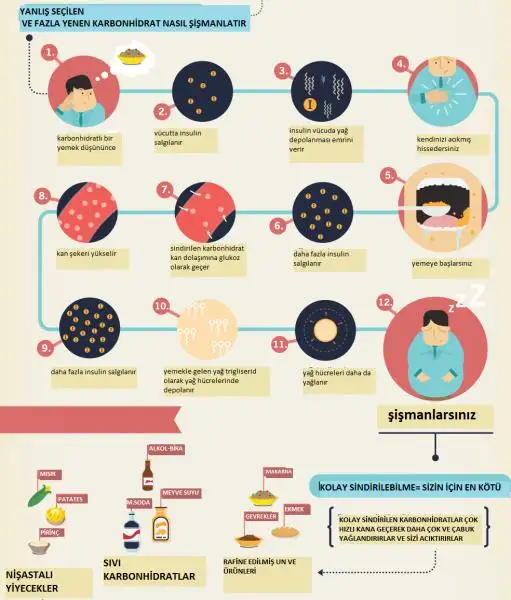 Ağzımıza aldığımız lokmayla birlikte sindirim sistemi çalışmaya başlıyor. Bu lokmanın içeriğine göre de pankreastan belirli bir miktarda insülin dediğimiz hormon salgılanır. Emilen karbonhidratların miktarıyla orantılı olan bu insülin, besinin hücre içine girmesini sağlayarak bundan faydalanmamzı yani enerji olarak kullanmamıza, kullanmamıza vesile olur. Ancak ihtiyaçtan fazla karbonhidrat kanda olduğunda bu fazlalık yağa dönüştürülerek depolanır. Bu ikinci basamağın da vesilesi insülindir.