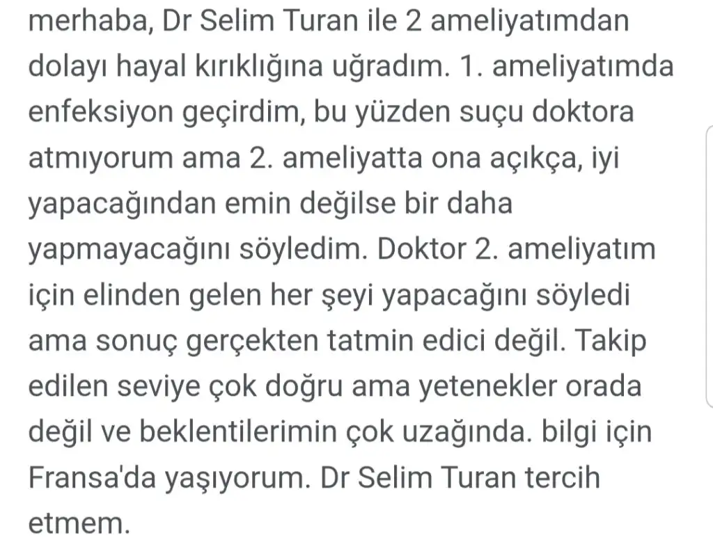 Benim doktorum da gençti.Selim bey gibi harika bir instagram profili vardı ama maalesef ki 2020 den bu yana yüzüm pek gülmedi.Bakın buralarda ameliyat olanların yorumlarını okuyorum .