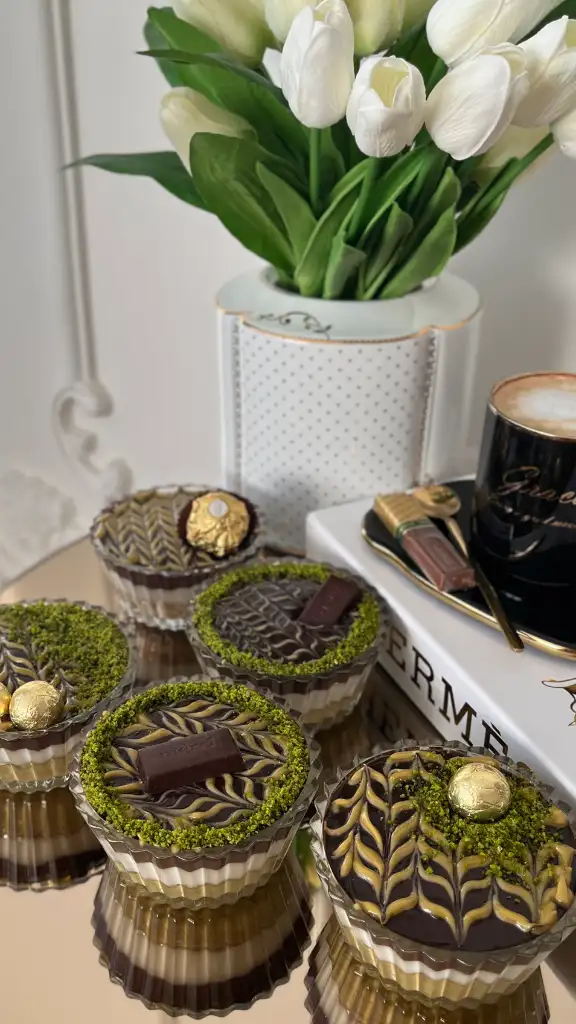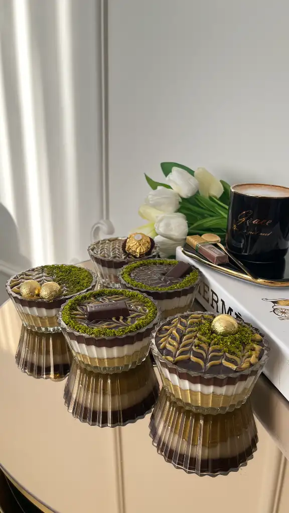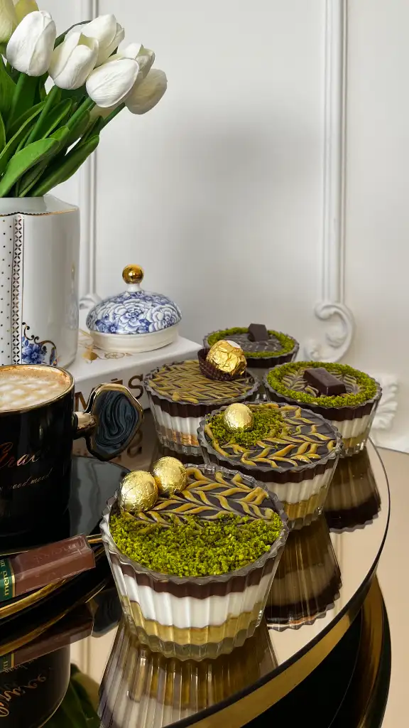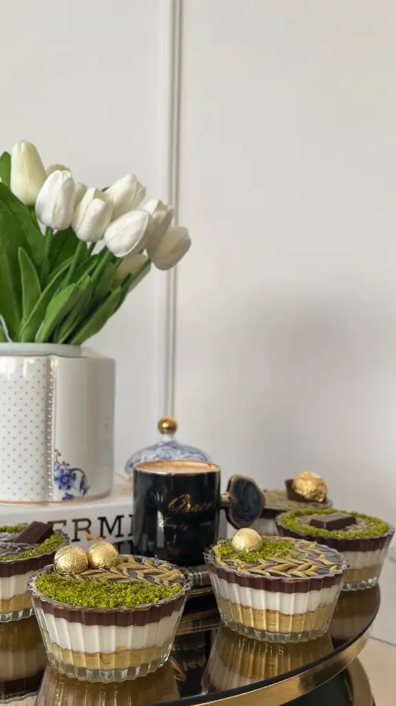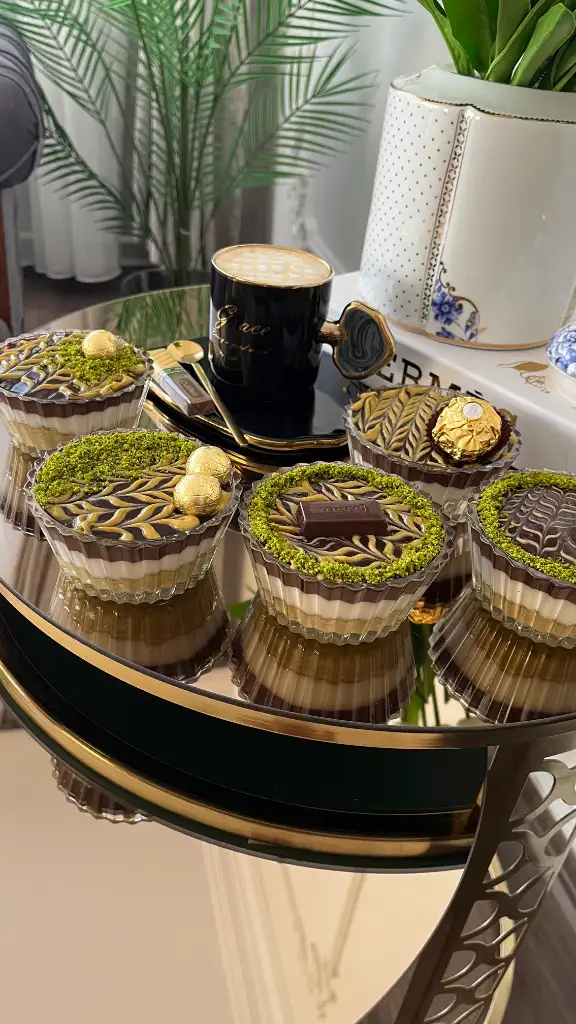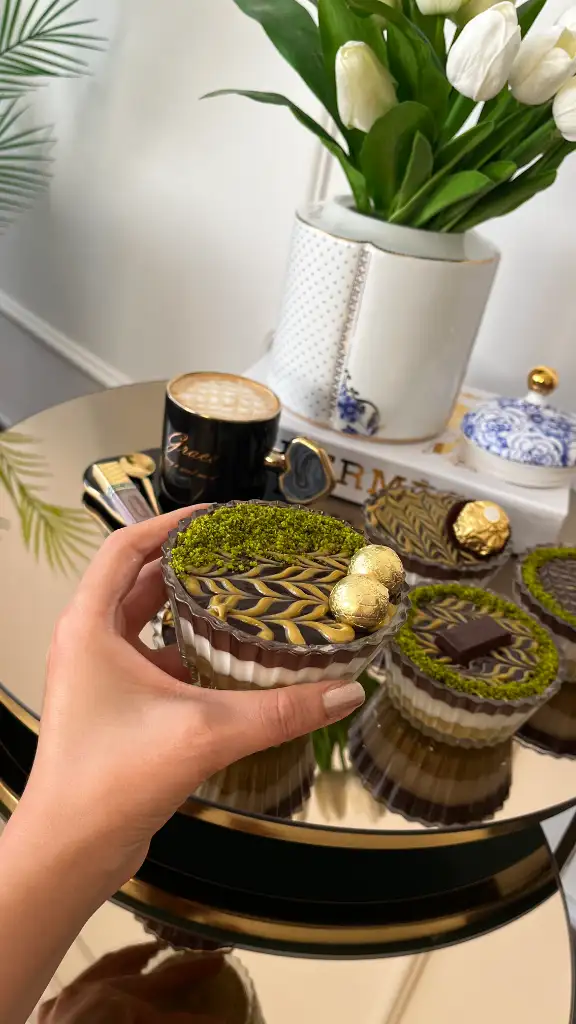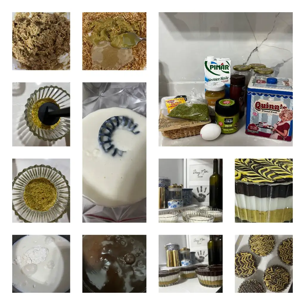 Kaselerin dibine fıstıklı harçtan koyup yayıyoruz. Üstüne muhallebiden ekliyoruz. En üst kat için sıvı kremayı kaynama noktasına getirip ocağın altını kapattıktan sonra çikolatayı ekliyoruz ama ben burada hazır paket çikolata sosu kullandım. Muhallebinin üstüne ganajımızı döküp süslüyoruz. Denerseniz şimdiden afiyet olsun.