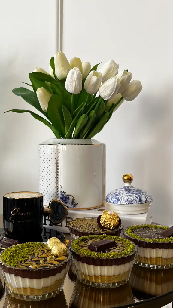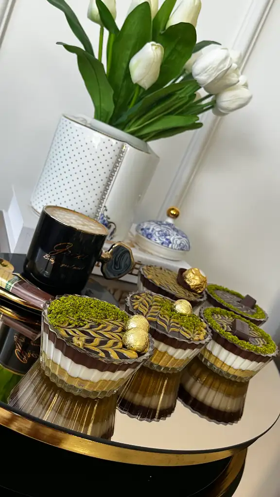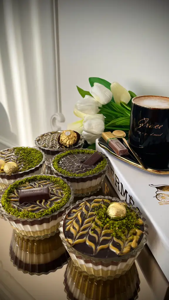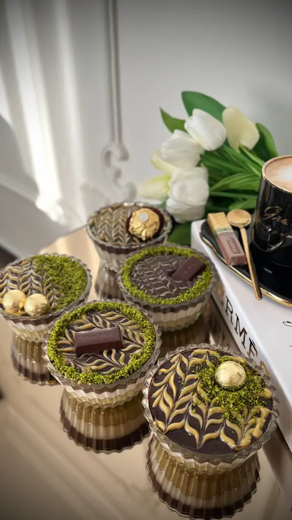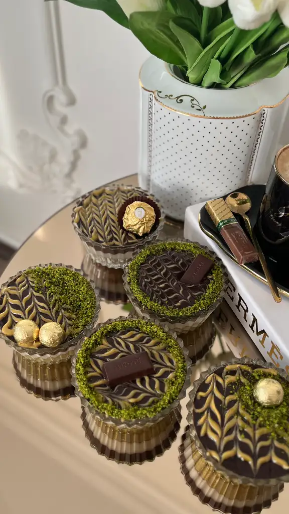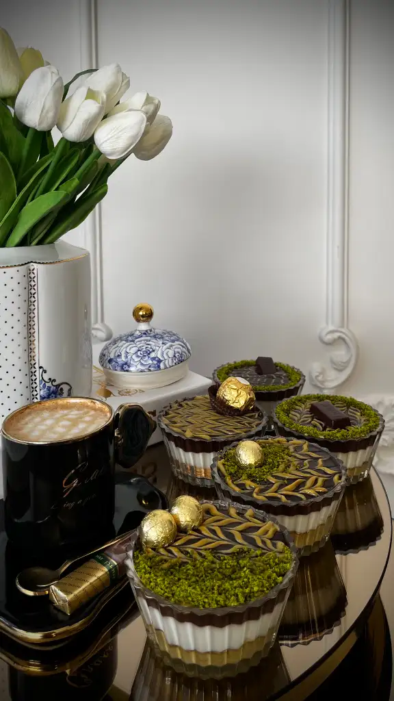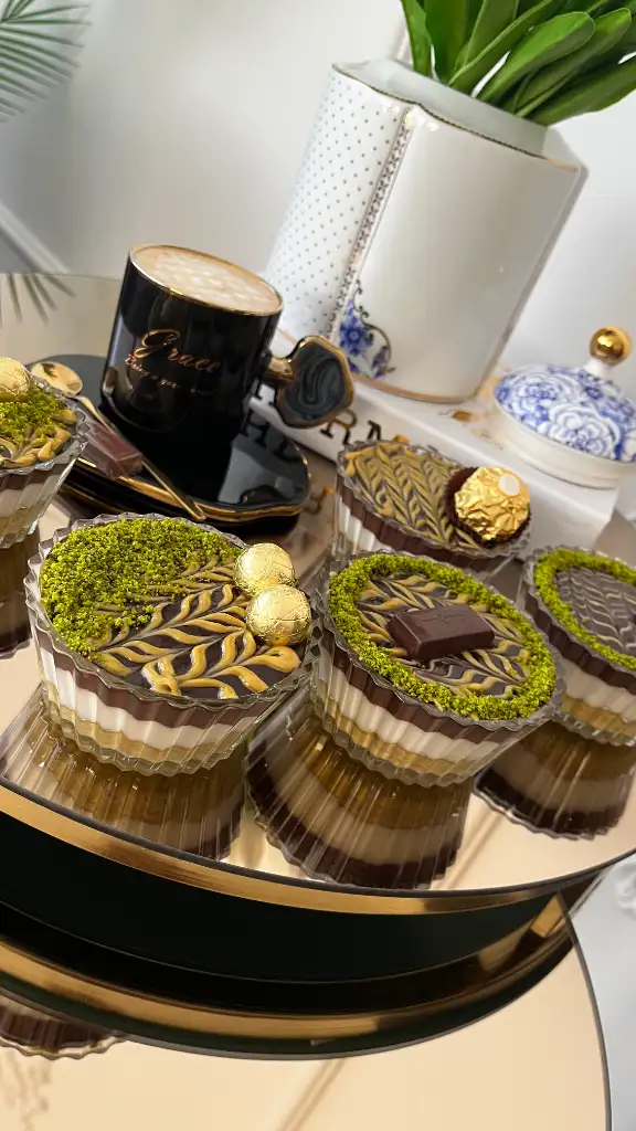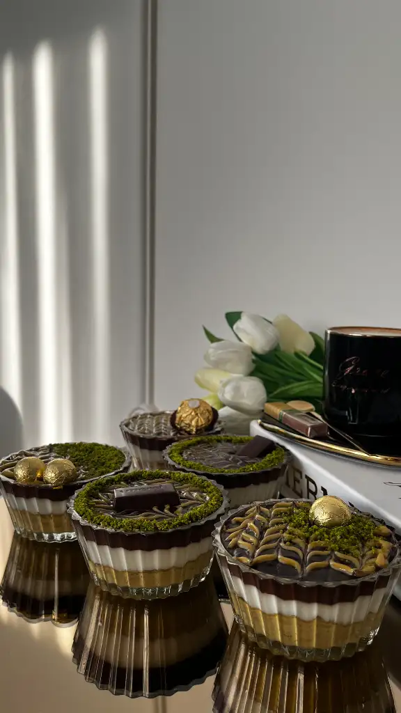 Kaselerin dibine fıstıklı harçtan koyup yayıyoruz. Üstüne muhallebiden ekliyoruz. En üst kat için sıvı kremayı kaynama noktasına getirip ocağın altını kapattıktan sonra çikolatayı ekliyoruz ama ben burada hazır paket çikolata sosu kullandım. Muhallebinin üstüne ganajımızı döküp süslüyoruz. Denerseniz şimdiden afiyet olsun.