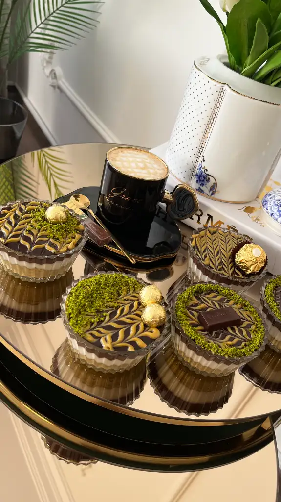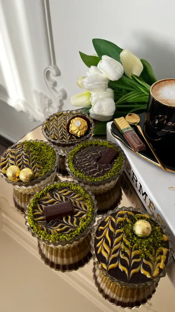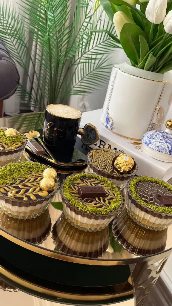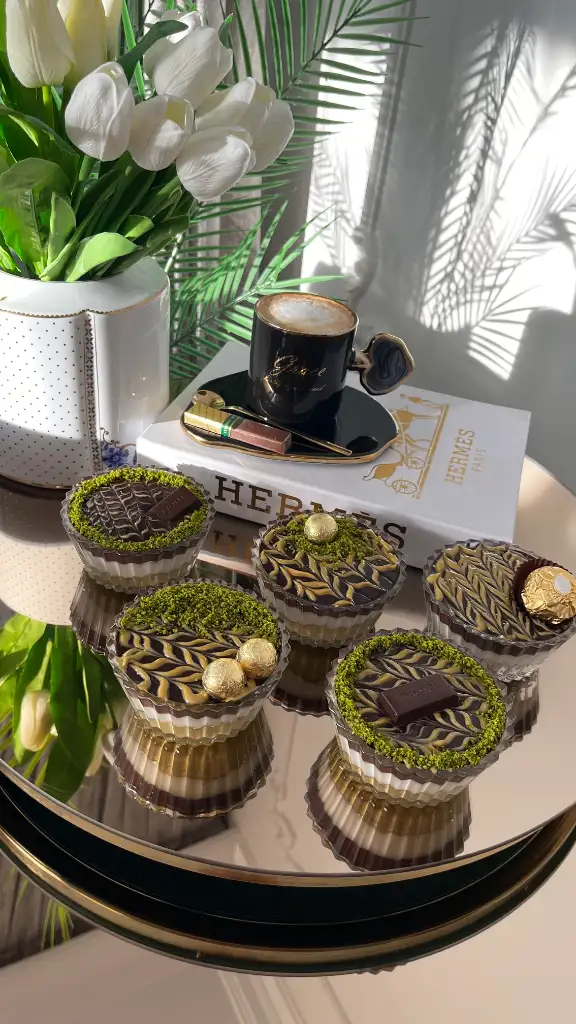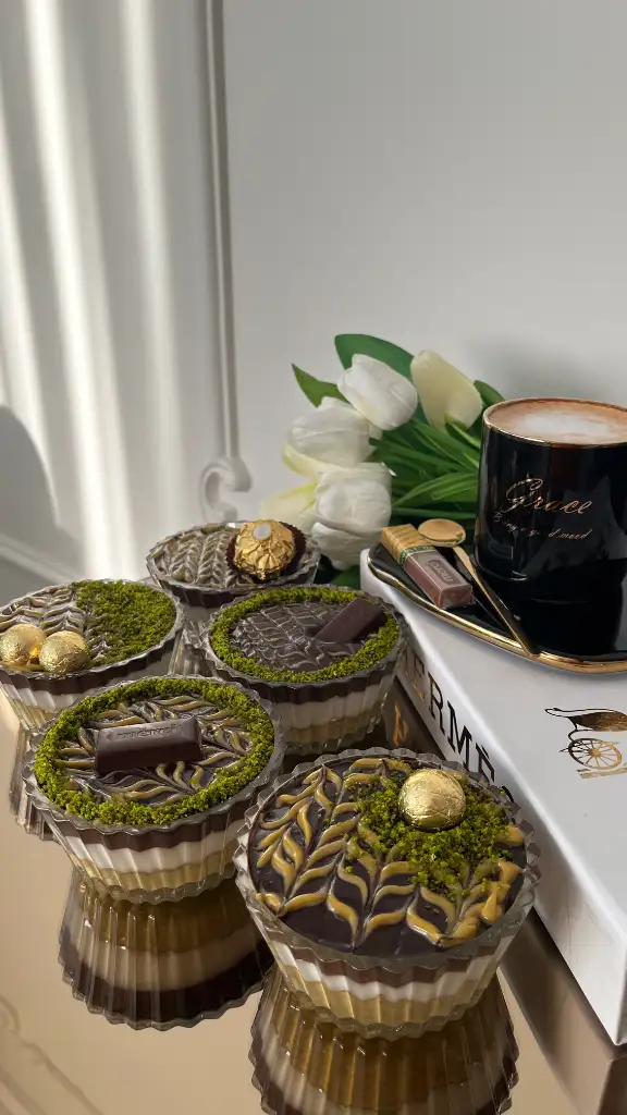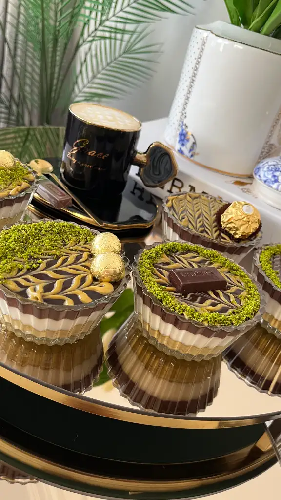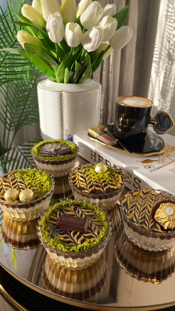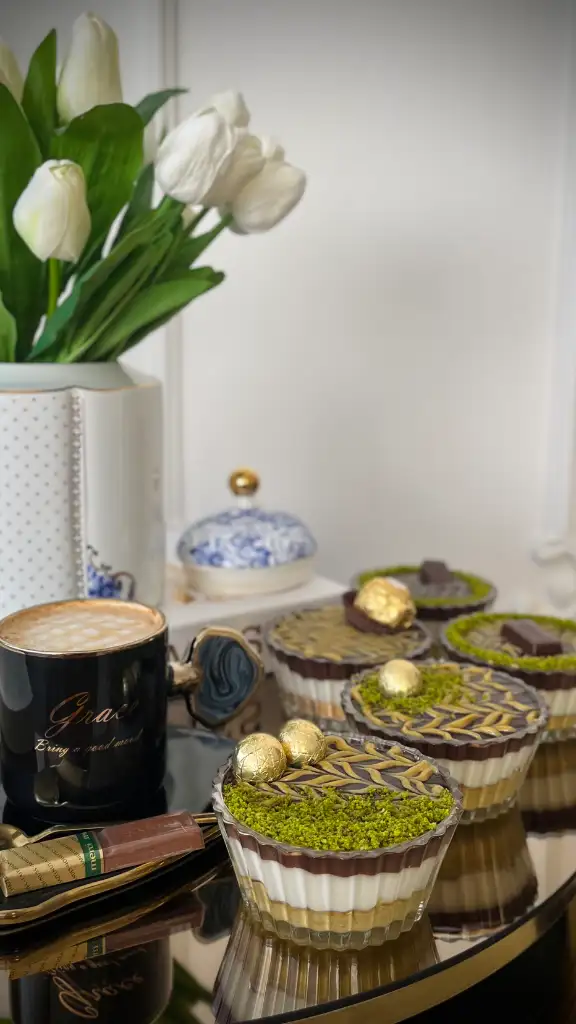 Kaselerin dibine fıstıklı harçtan koyup yayıyoruz. Üstüne muhallebiden ekliyoruz. En üst kat için sıvı kremayı kaynama noktasına getirip ocağın altını kapattıktan sonra çikolatayı ekliyoruz ama ben burada hazır paket çikolata sosu kullandım. Muhallebinin üstüne ganajımızı döküp süslüyoruz. Denerseniz şimdiden afiyet olsun.