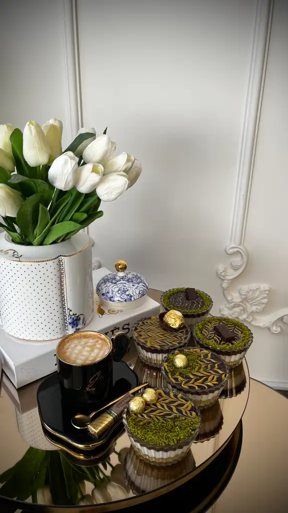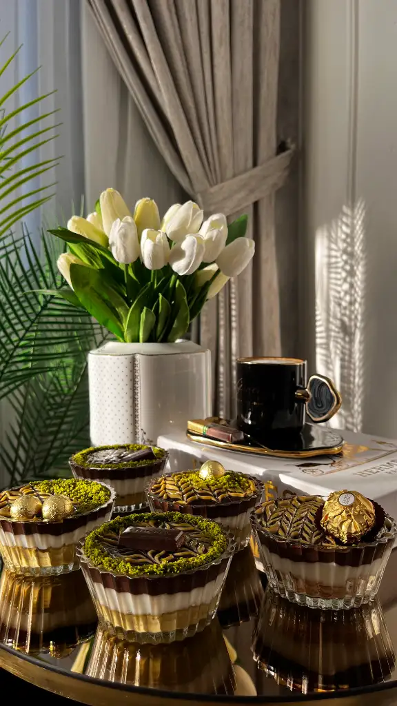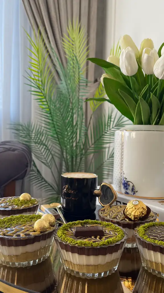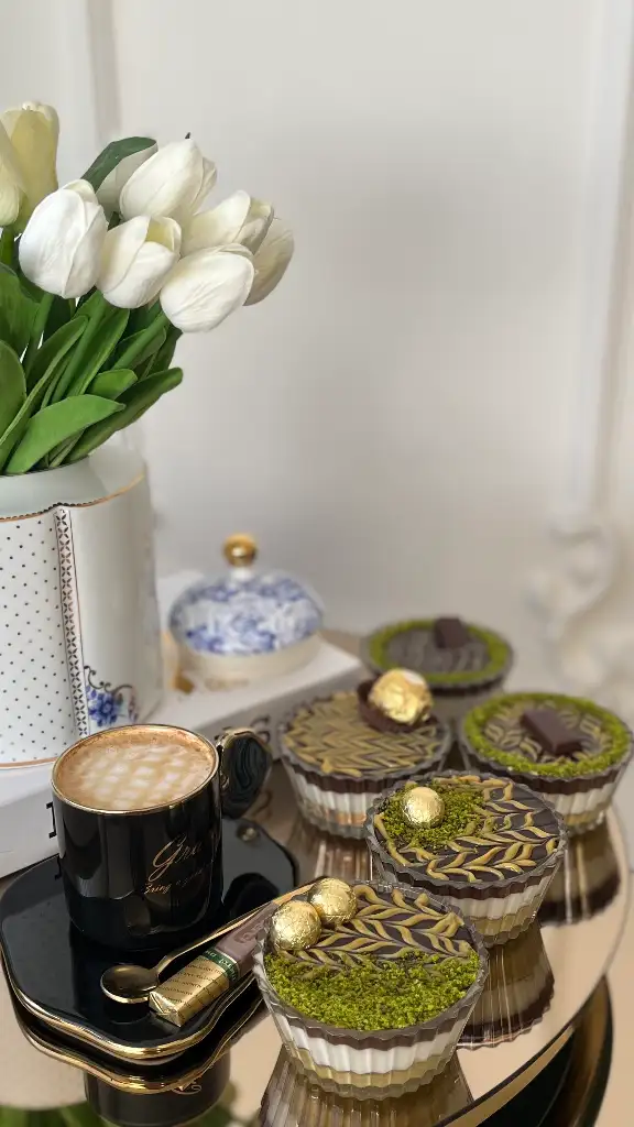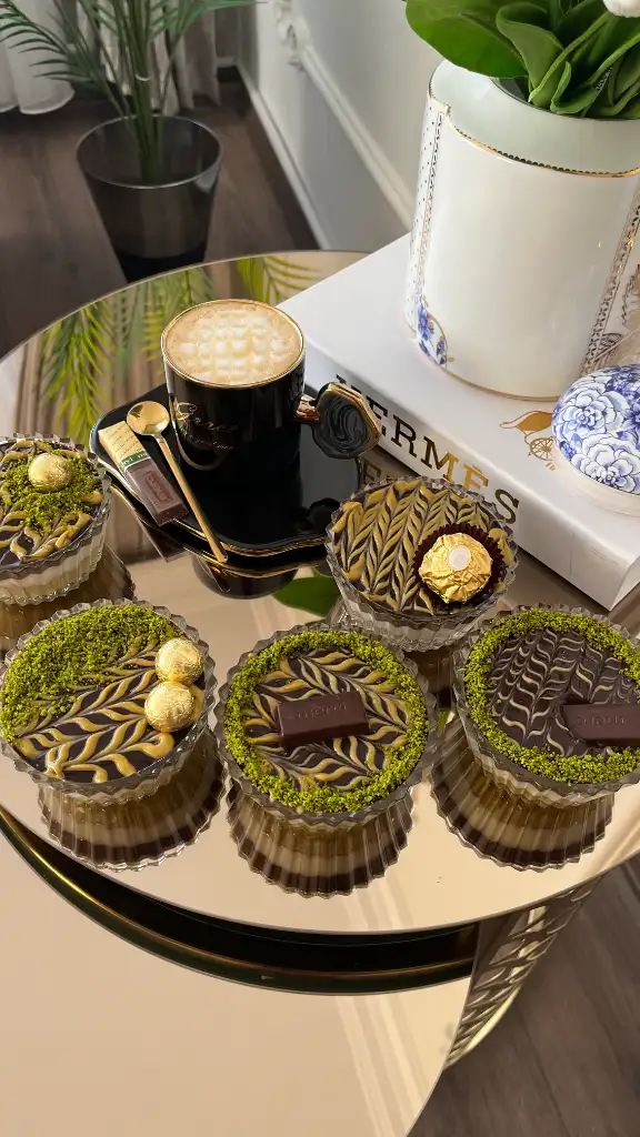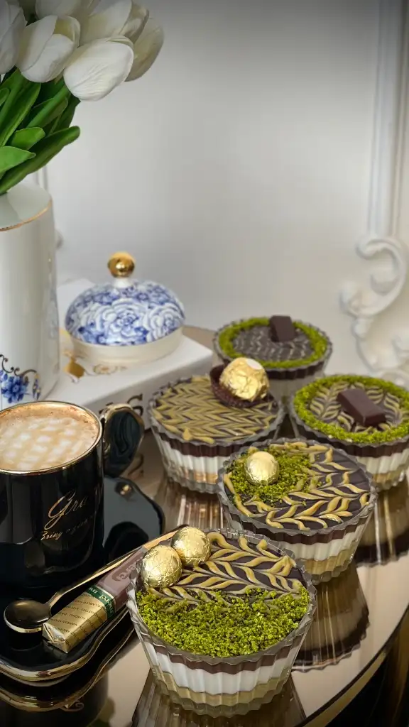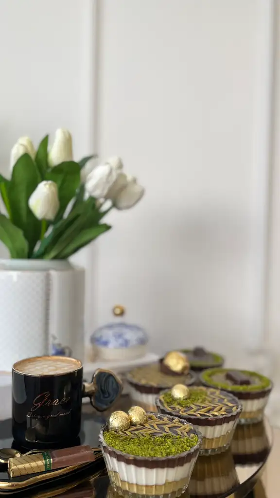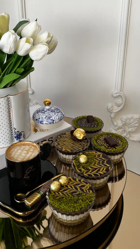 Kaselerin dibine fıstıklı harçtan koyup yayıyoruz. Üstüne muhallebiden ekliyoruz. En üst kat için sıvı kremayı kaynama noktasına getirip ocağın altını kapattıktan sonra çikolatayı ekliyoruz ama ben burada hazır paket çikolata sosu kullandım. Muhallebinin üstüne ganajımızı döküp süslüyoruz. Denerseniz şimdiden afiyet olsun.