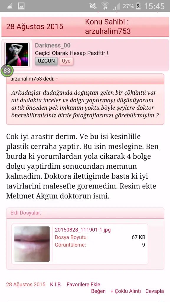 Mehmet bey bir hastasının dudagini basaramayıp sonradan düzeltme tedavisi bile uygulamamis forumda dolgu üzerine yorum ararken buna denk geldim özelikle onu tavsiye edenler ucuz kurtulmuslar bence insan bu resme denk gelince o doktor hakkında kafasında soru işareti beliriyor bir düşün derim ve seçim konusunda çoook iyi araştır sadece iyi yorumlar üzerine seçim yapma her ikisinide araştır değerlendir ona göre adım at hayatın boyunca mutsuz olucan yanlış bir seçim yapma düzeltmek için fazla masrafa girersin sonraCanım öncelikle güle güle kullan: )) benmde üst dudak cok ince gülünce kayboluyor resmen, tavsiyen icin tesekkurler aklımda buluncak :)