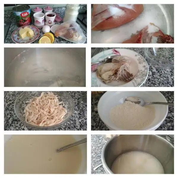 1. aşamamızda öncelikle tavuğu düdüklüye koyuyor, üzerine 2 çay kaşığı tuz ve üzerini geçecek kadar su ile haşlamaya başlıyoruz. 15-20 dk piştikten sonra tavuk etini çıkartıp didiyoruz.