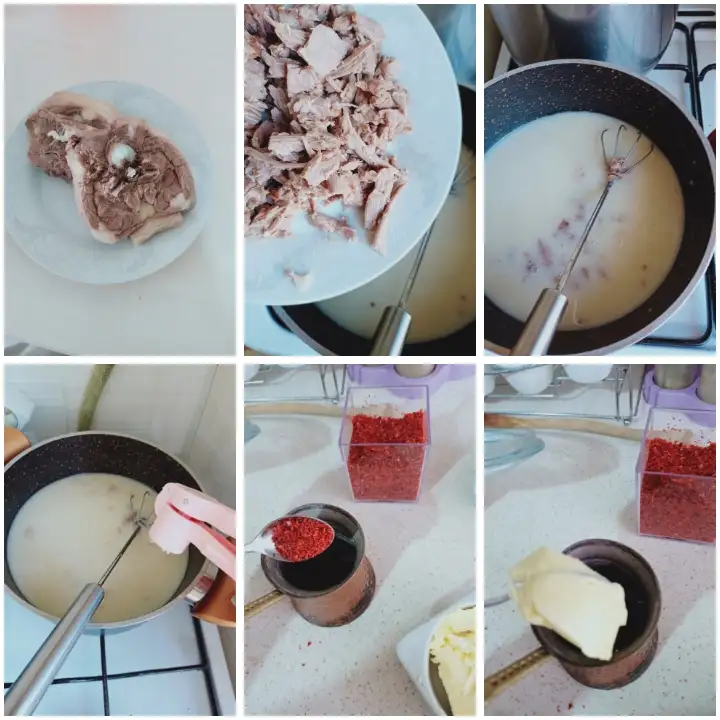 Kaynayan etimizin suyunu ve etini de didikleyip çorbaya ekliyoruz kaynatiyoruz. Sarımsak ve tereyağı,pulbiberi de ekliyoruz.