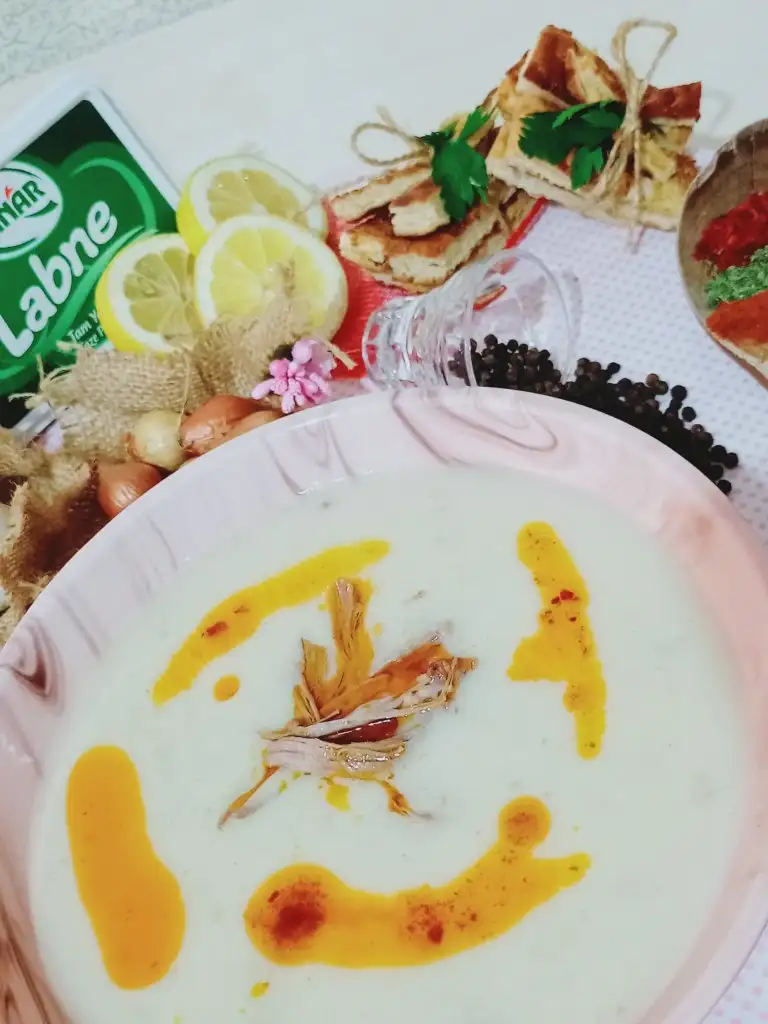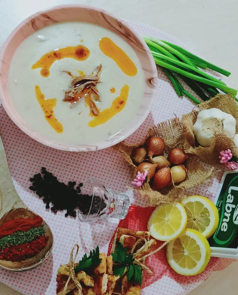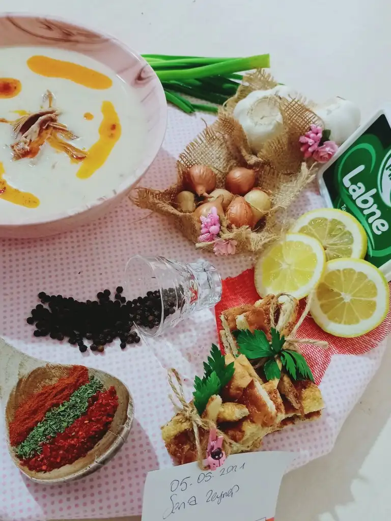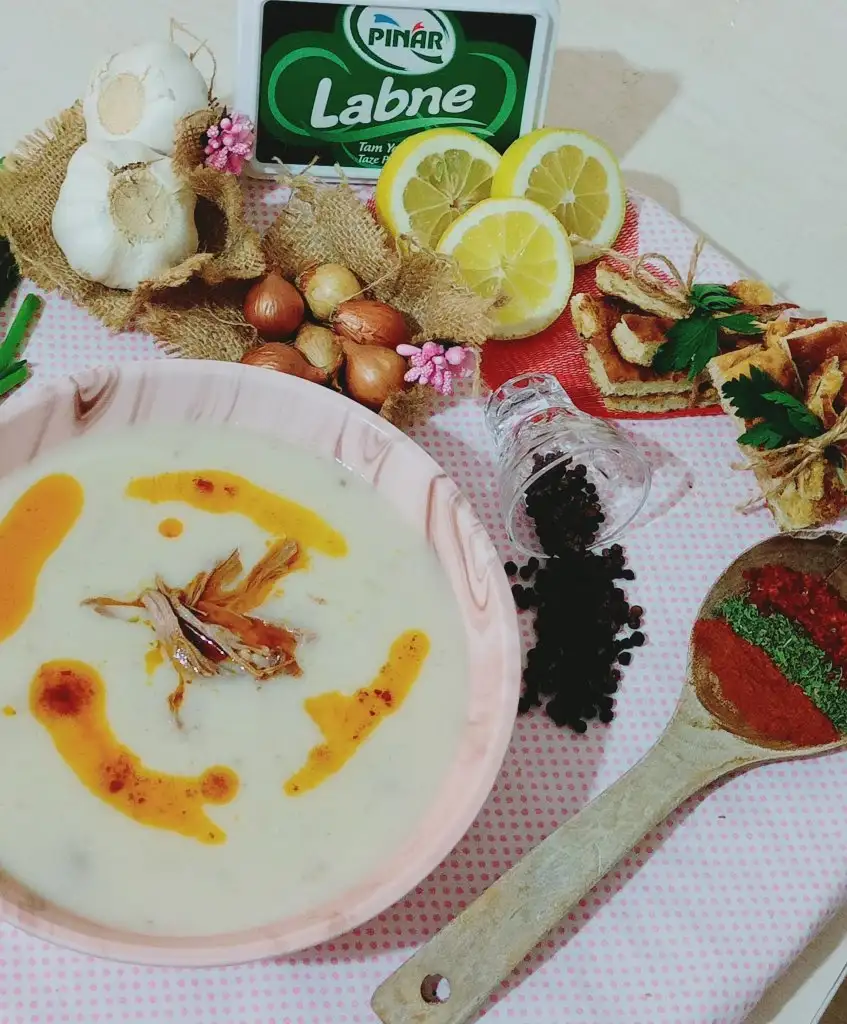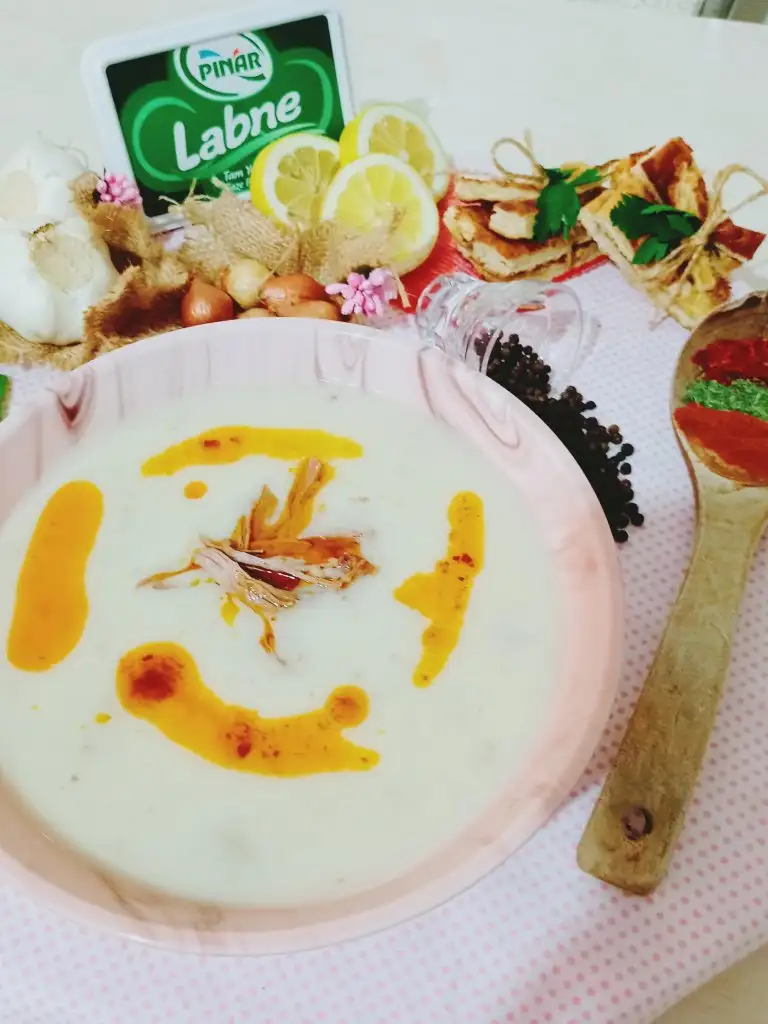 Diğer yandan çorbanın terbiyesini hazırlıyoruz. Bütün malzemeleri Labne,yoğurt,un,yumurtayı çırpıyoruz. İçine kemik suyunu ,limon suyunu ve tuzunu ilave ediyoruz.Eki Görüntüle 2842511