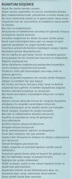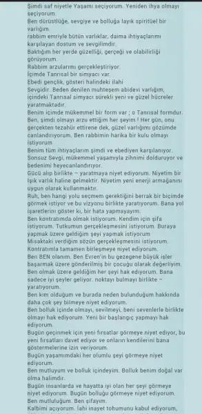 Canim bunu ses kaydi yapip dinliyorum demistin galiba dimi ?? Cok guzel birsey hersey var icinde yuregine saglik cok guzel yol gosteriyorsun bize her paylastigin sey gercekten bi isik cakmasina sebeb oluyor benim icimde :)Kızlarrrr 2 haftadir uzerine calistigim bir olumlama vardi,cok kapsamli demistim paylasmistim.Su an nurtopu gibi istiridye kabugundan yeni çıkmıs parıl parlayan inci gibi muazzam güzellikte bir bilincalti kalıbım var; artik o benim icsellestirdigim gercegim.Tüm güzelliklerini almaya ve deneyimlemeye hazırim.Rabbime şükürler olsun denk geldigimnicin Eş Şekur adıyla ,tam ihtiyacim olan olumlamalardi :)Belki hangisiydi diye merak edenler icin yeniden paylasiyorum