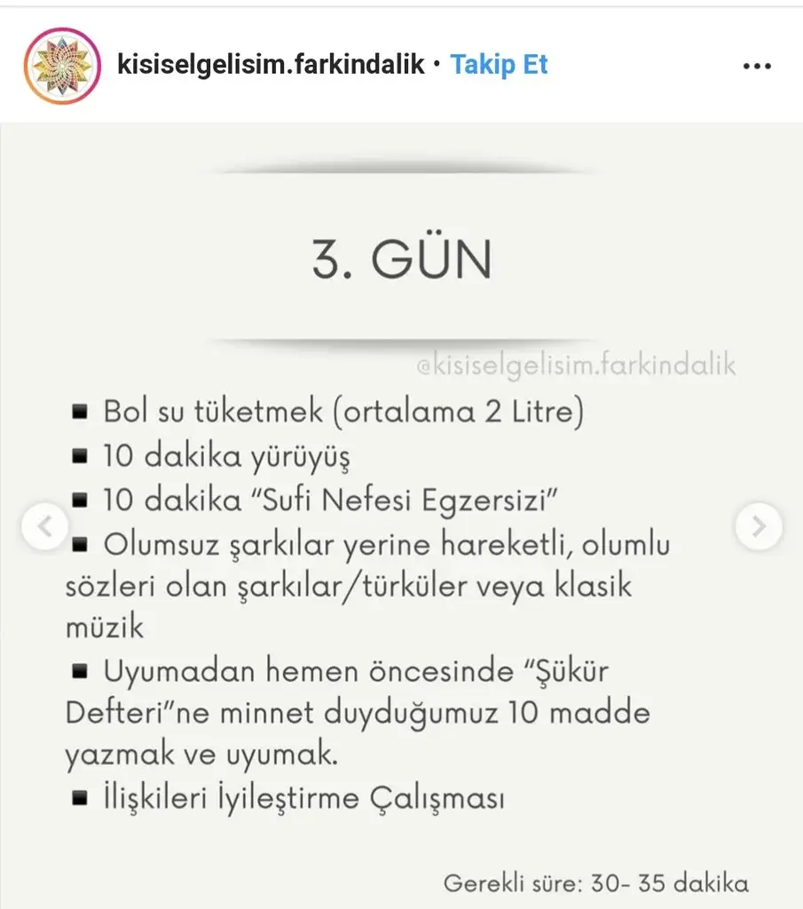 ▪sabah kalkar kalkmaz iki bardak su içiyoruz. (2 litre suyu gün içerisinde tamamlıyoruz.) ▪10 dakika yürüyüş, imkanı olmayanlar egzersiz de yapabilir. ▪Günün (rahatsız edilmeyeceğiniz) her hangi bir saatinde “Sufi Nefesi” egzersizini yapıyoruz. ▪Müzik dinlerken yine seçici davranıyoruz :) ▪Uyumadan hemen öncesinde “Şükür Defteri”mize yazıp uyuyoruz. ▪ Rahatsız edilemeyeceğimiz, müsait bir zamanımızda “İlişkileri İyileştirme Çalışması” yapıyoruz.